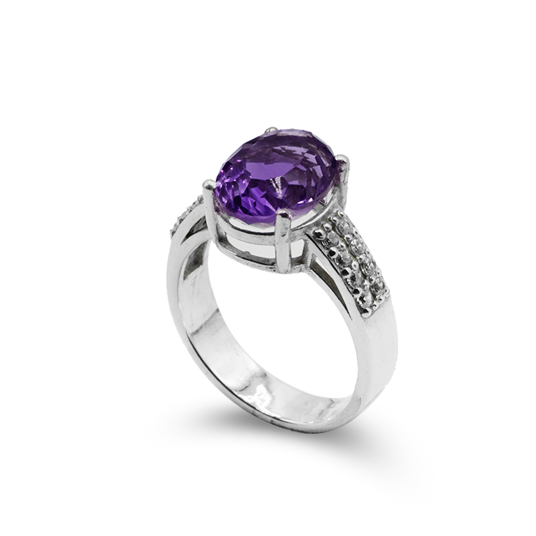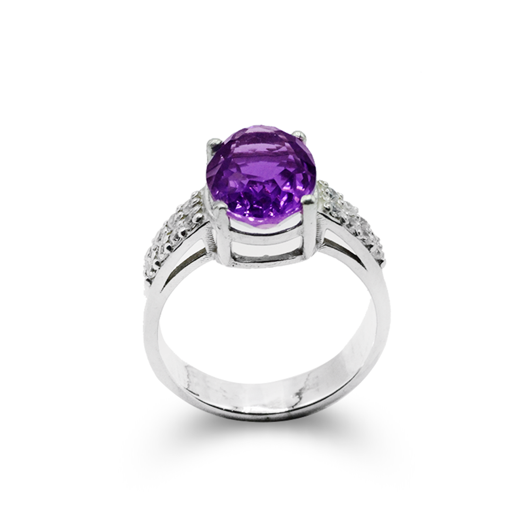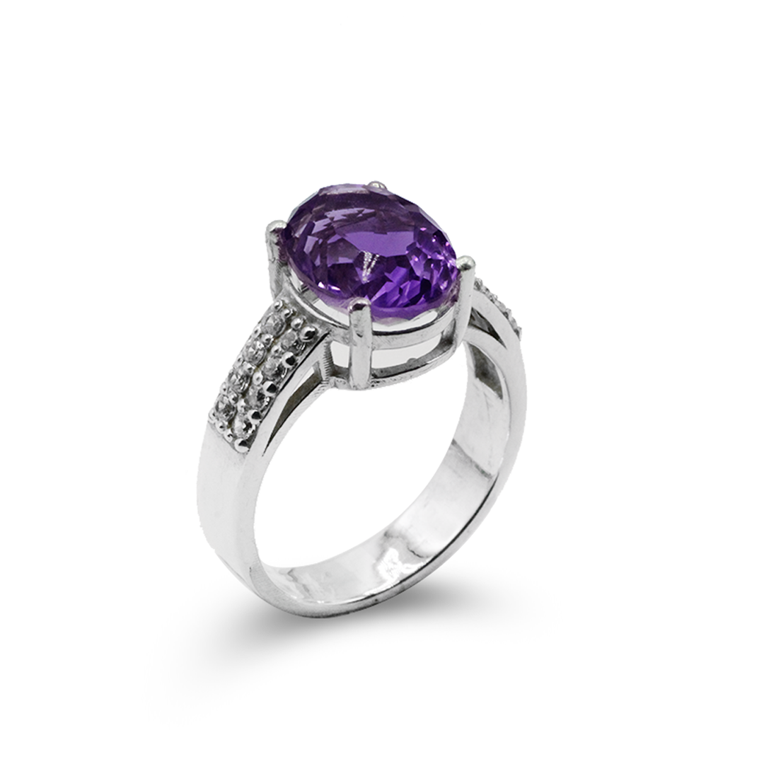 The Amethyst Women Ring with Zircon Band Design combines the brilliant appeal of Zircon with the organic beauty of amethyst. This gorgeous ring by Jawa Gems has a captivating amethyst, which is highlighted by a band set with glittering zircon stones. The sparkling brightness of the zircon and the rich, regal shade of the amethyst combine to create a stunning visual effect that elevates the entire design.