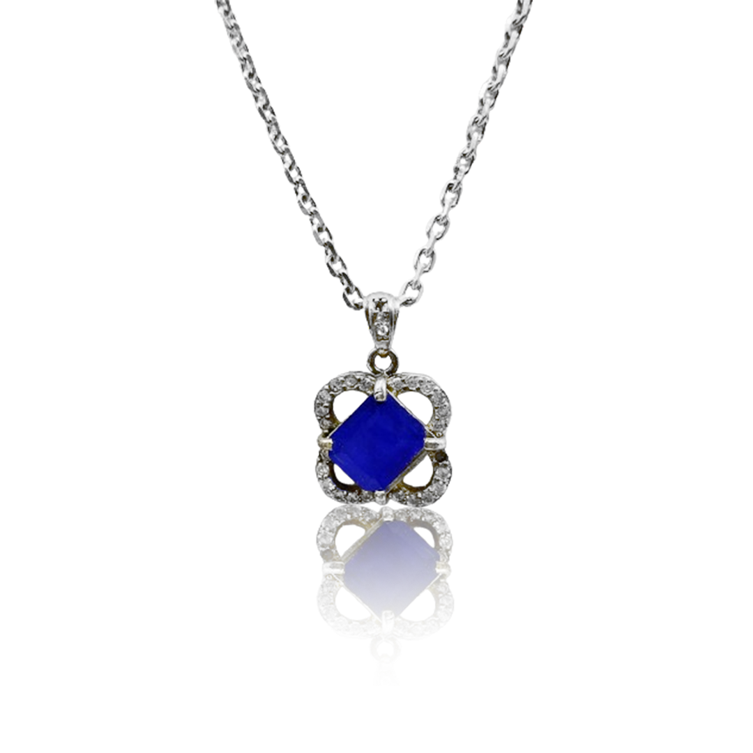 This Blue Sapphire Pendant in Zircon Route Design features a brilliant blue sapphire gemstone surrounded by sparkling zircons. Set in pure silver, this pendant combines modern style with timeless elegance. The zircon accents enhance the sapphire’s deep blue hue, creating a striking contrast that catches the light beautifully. Ideal for any occasion, it adds sophistication and charm to your look, making it a perfect statement piece.