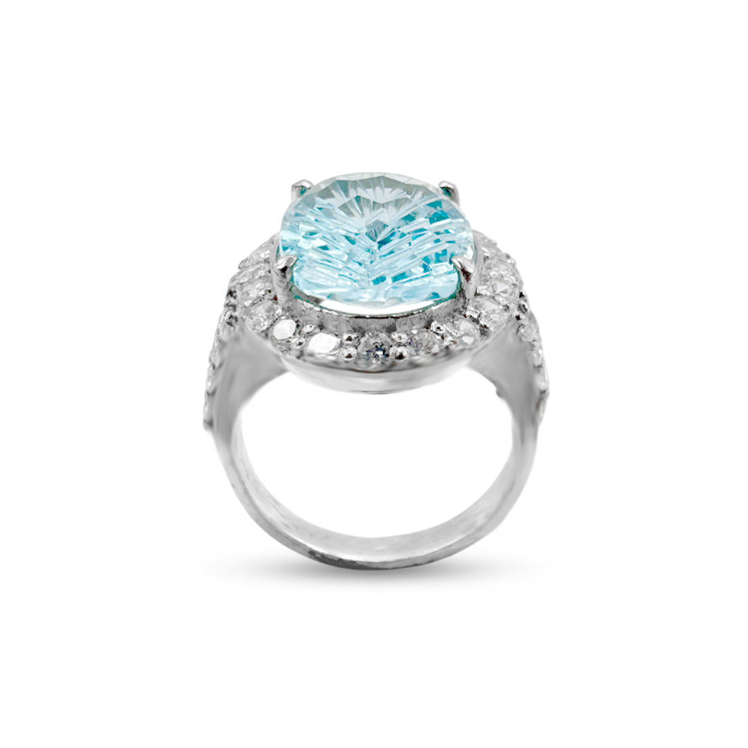 Jawa Gems’ Blue Topaz Women Ring – Halo V Band Design offers a sleek, V-shaped band encircling a sparkling halo of stones around the blue topaz. The healing properties of blue topaz encourage emotional healing and communication, while the striking design offers a fashionable, yet meaningful piece of jewelry.