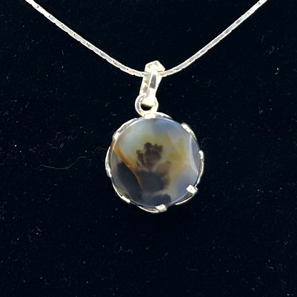 This Dendritic Agate Pendant in Lattice Design showcases the natural beauty of dendritic agate, with delicate, fern-like inclusions set within a refined lattice pattern. The intricate design enhances the earthy tones of the agate, creating a harmonious and elegant piece of jewelry.