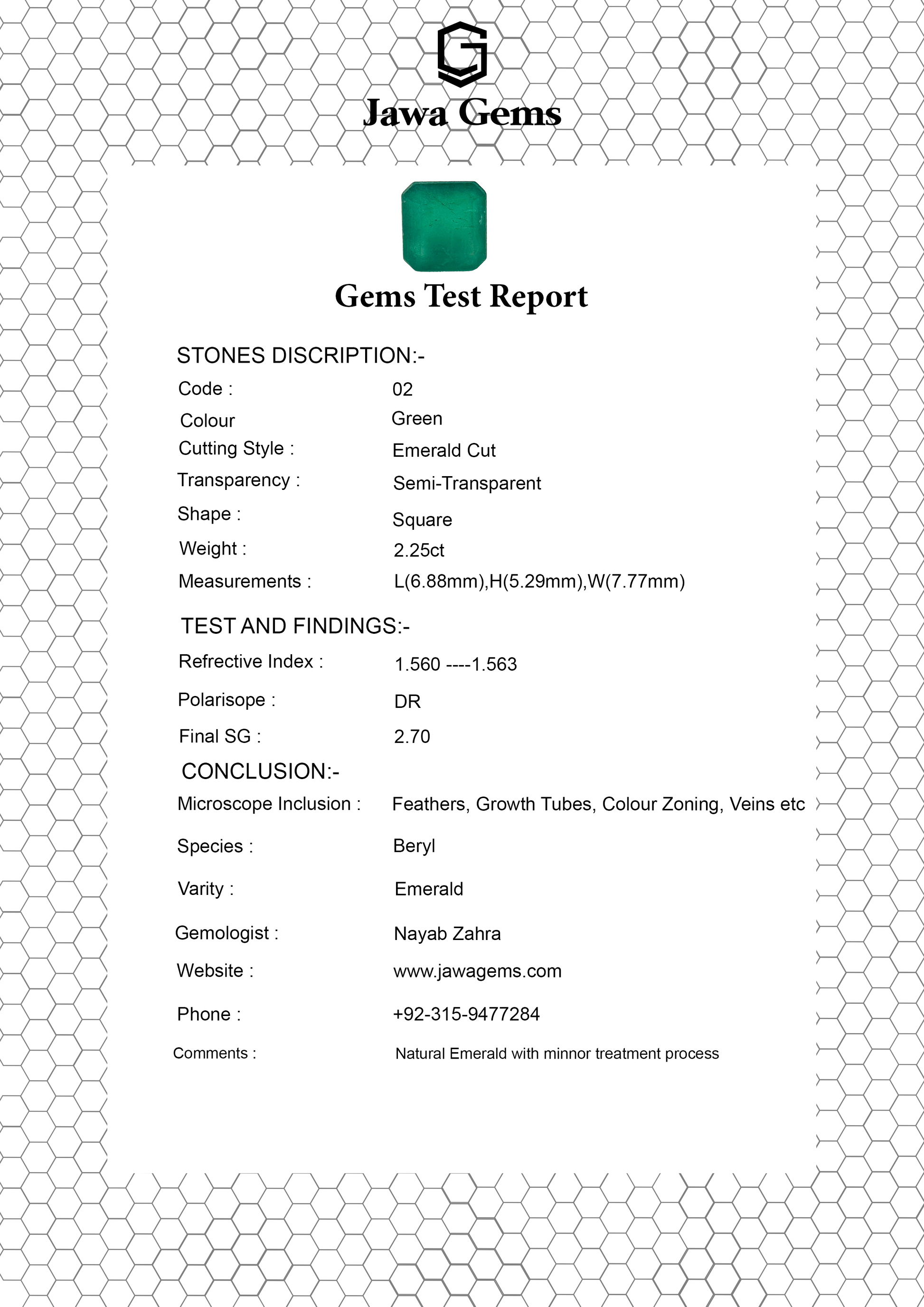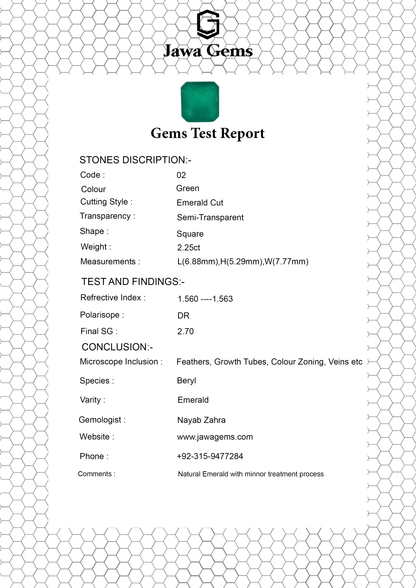 This stunning 2.25-carat Emerald is a lab-certified natural gemstone renowned for its rich green color and powerful benefits. Emeralds are believed to enhance emotional healing, love, and growth, making them ideal for fostering harmony in relationships. Known for its calming energy, this stone also promotes clarity of thought and strengthens intuition. Perfect for those seeking renewal, prosperity, and inner balance, this emerald combines beauty with positive, healing energy.