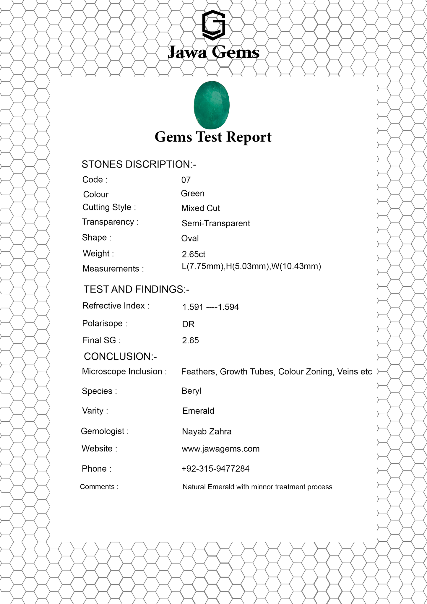 This stunning 2.65-carat Emerald is a lab-certified natural gemstone renowned for its rich green color and powerful benefits. Emeralds are believed to enhance emotional healing, love, and growth, making them ideal for fostering harmony in relationships. Known for its calming energy, this stone also promotes clarity of thought and strengthens intuition. Perfect for those seeking renewal, prosperity, and inner balance, this emerald combines beauty with positive, healing energy.