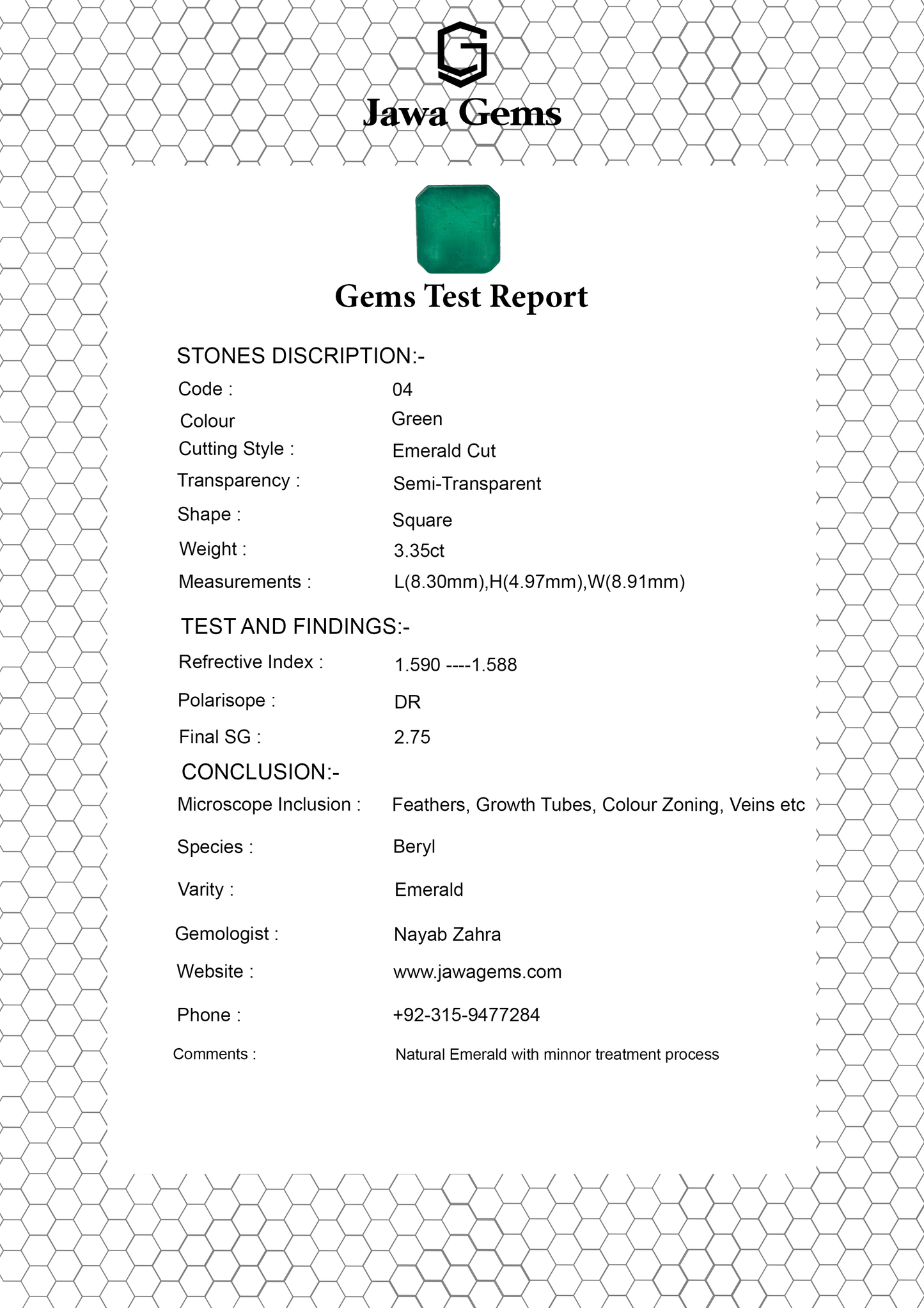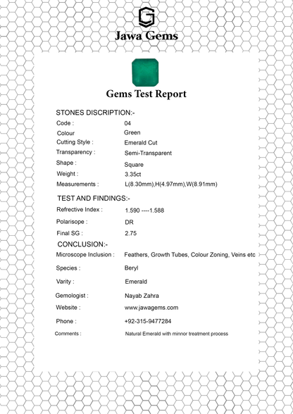This stunning 3.35-carat Emerald is a lab-certified natural gemstone renowned for its rich green color and powerful benefits. Emeralds are believed to enhance emotional healing, love, and growth, making them ideal for fostering harmony in relationships. Known for its calming energy, this stone also promotes clarity of thought and strengthens intuition. Perfect for those seeking renewal, prosperity, and inner balance, this emerald combines beauty with positive, healing energy.