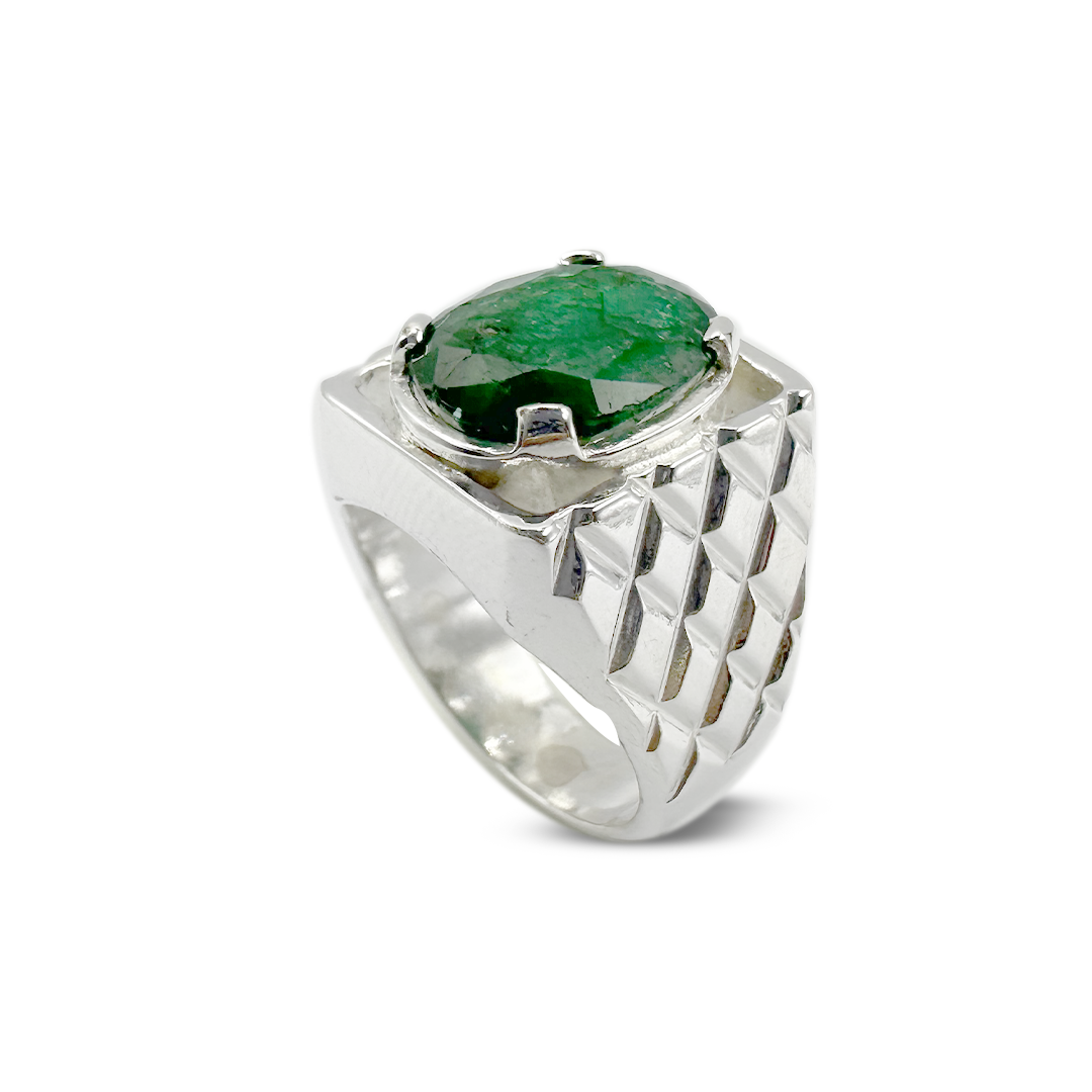 Jawa Gems' Emerald Men Ring – Tile Band Design features a sleek, modern band composed of individual tile-like segments, framing the vibrant emerald stone. Known for its clarity and balancing energy, emerald promotes emotional healing and growth. This stylish design makes a bold statement, offering both elegance and the gemstone’s rejuvenating benefits.