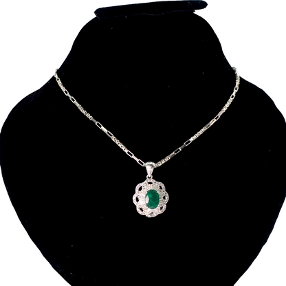 The Emerald Pendant - Zircon Floral Design features a beautiful floral motif, with emerald gemstones at the center of delicate zircon petals. This pendant is not only a striking piece of jewelry but also harnesses the healing qualities of emerald, which is known to promote clarity, peace, and love. The silver setting adds elegance to this unique and meaningful design.