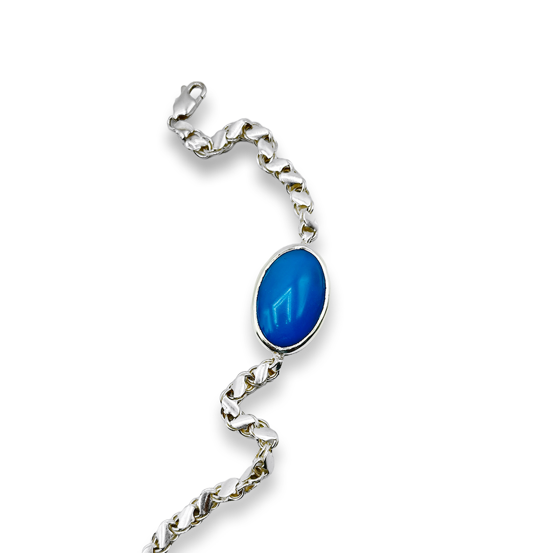 The Feroza Bracelet with Lock Chain Design is crafted in pure silver, offering a secure and stylish way to wear Turquoise. Known for its emotional healing benefits, Turquoise brings peace and tranquility. The lock chain design combines strength and elegance, creating a fashionable bracelet that provides both spiritual benefits and a bold statement.