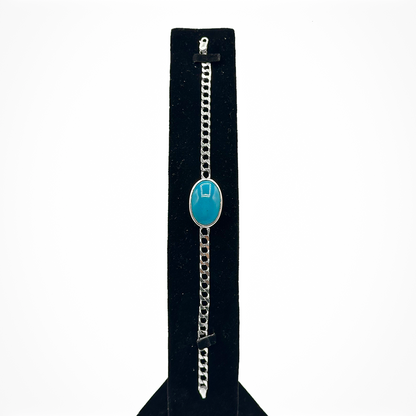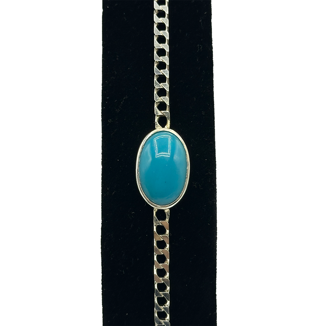 This Feroza Bracelet, crafted in pure silver, features a vintage wrist design that combines sophistication with the healing energy of Turquoise. Turquoise is revered for its ability to bring peace and harmony to the wearer. The vintage design exudes timeless elegance, making this bracelet a perfect accessory for those who seek both style and spiritual well-being.