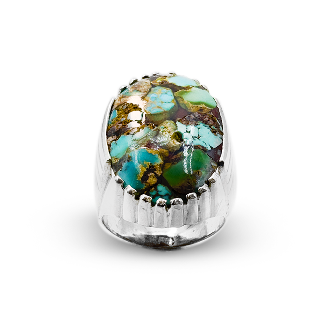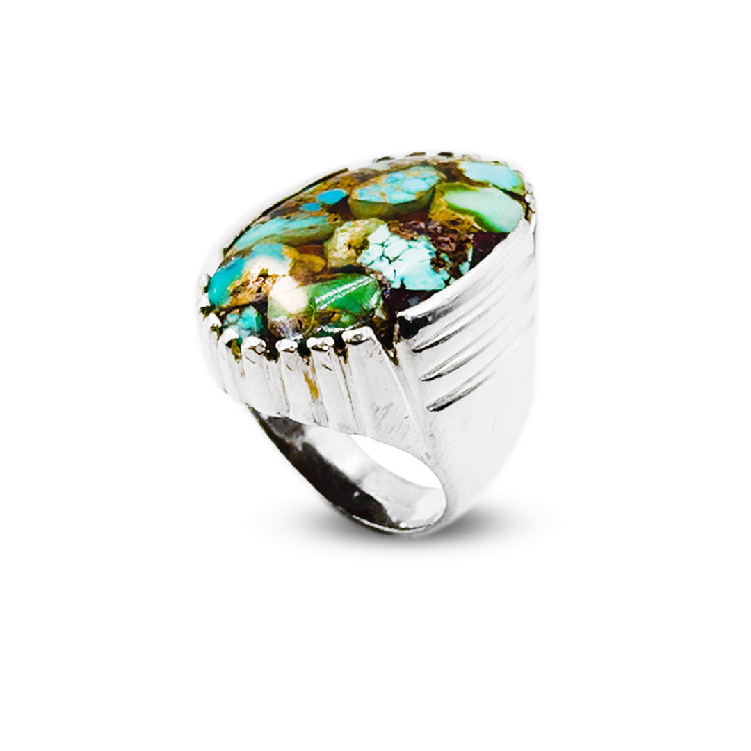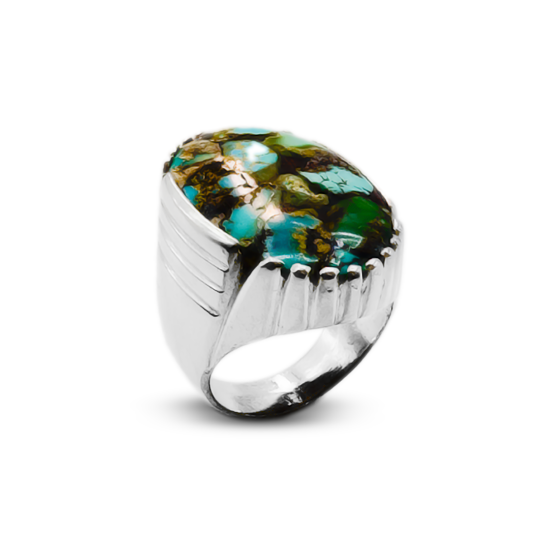 The Sigma Lines by Jawa Gems evokes a modern, clean look that brings out the innate elegance of the Feroza stone. Adorned with a sterling silver band, it features a succession of clean and linear Sigma-shaped lines that result in a stunning visual effect, complete with a Feroza centerpiece. This versatile Feroza Men Ring can be styled up or down and ensures that your wrists are kept sophisticatedly and stylishly adorned for all formal and casual events.
