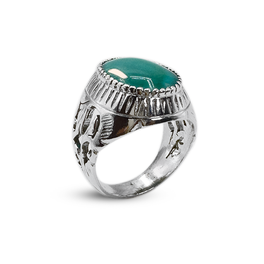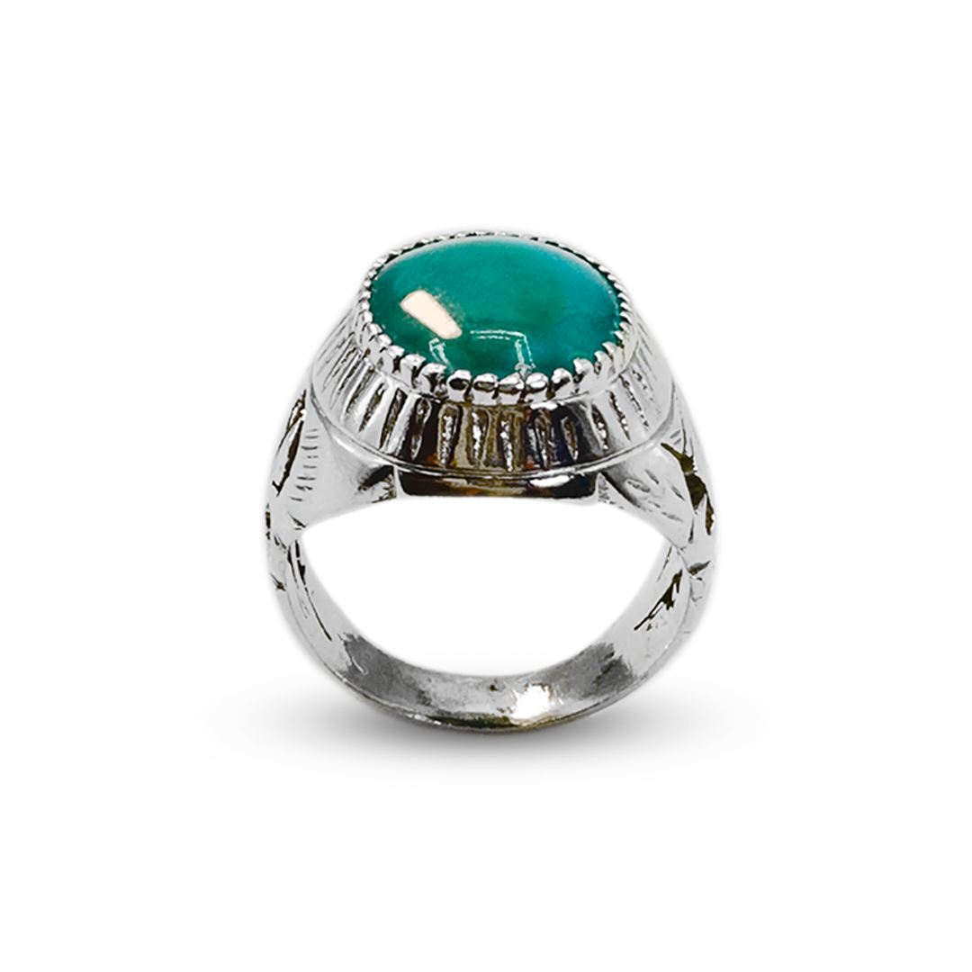 Jawa Gems' Feroza Men Ring is instantly noticed, with its sterling silver scrollwork ring embellished with the ancient beauty of Feroza. The band is beautified by an attractive scrollwork pattern, giving depth and dimension to this classic design, while the stone stays in the center. This is a real Silver Scrollwork Ring that screams of prowess and elegance.