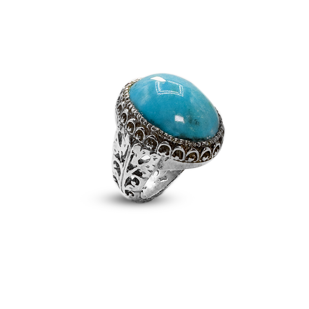 This stunning ring pays homage to the rich cultural heritage of Faisalabad, Pakistan. This is one beautiful Traditional Faisalabad Design Ring by Jawa Gems. But on a serious note, it houses a Feroza stone in a sterling silver band that is further adorned with an intricate traditional pattern, which truly epitomizes the great skill of the team that forms Jawa Gems. This Feroza Men Ring sums up elegance in a classically modern way and will be an eye-catcher on any hand.