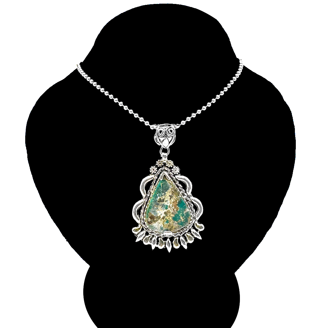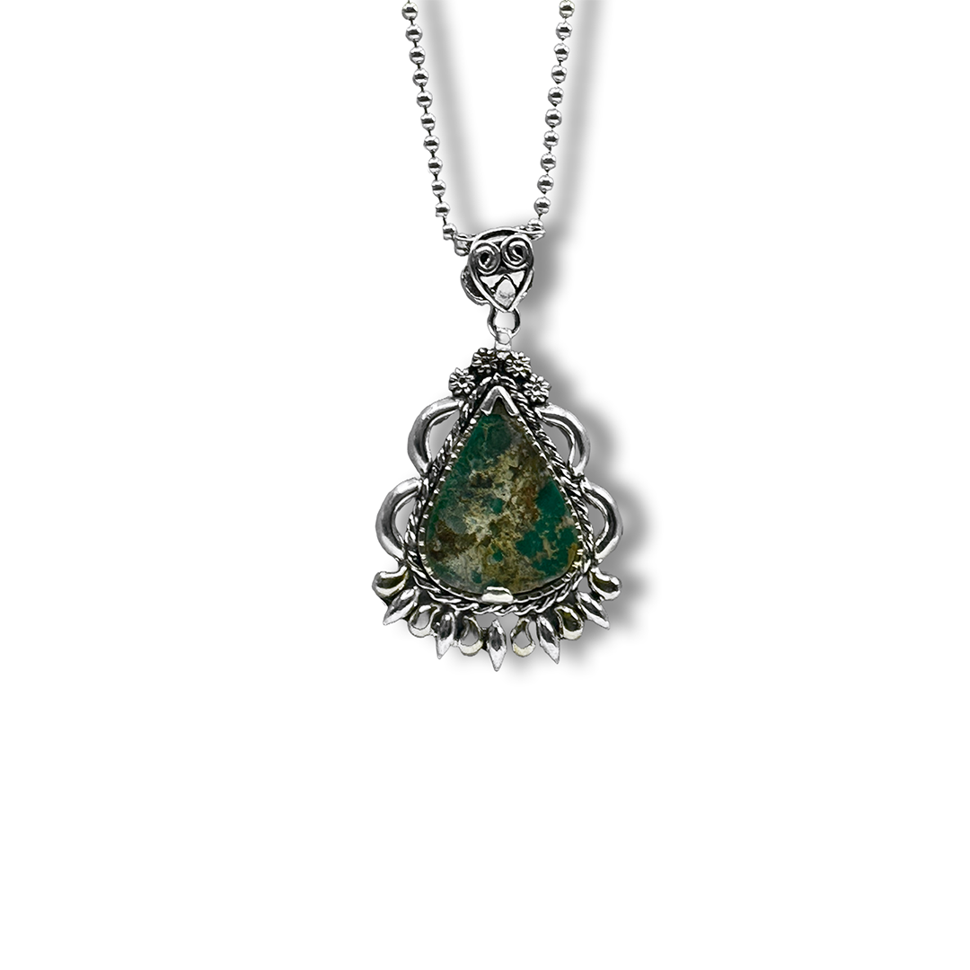 This Ancient Fame Design Feroza Pendant, made from pure silver, merges vintage elegance with the grounding energy of Turquoise. The stone is celebrated for its spiritual benefits, enhancing communication and self-expression. The ancient-inspired design invokes a sense of heritage and pride, making it ideal for those who appreciate timeless beauty with modern significance.