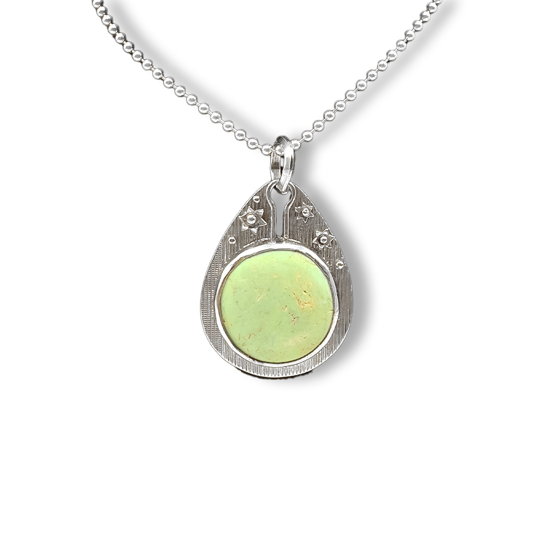 This pure silver Feroza Pendant features an oval bag design, surrounding a captivating Turquoise stone. Turquoise, known for its protective and calming qualities, is perfect for enhancing emotional clarity. The oval shape represents balance and infinity, making this pendant a meaningful and stylish accessory. Ideal for those seeking a blend of traditional design and modern wellness benefits.