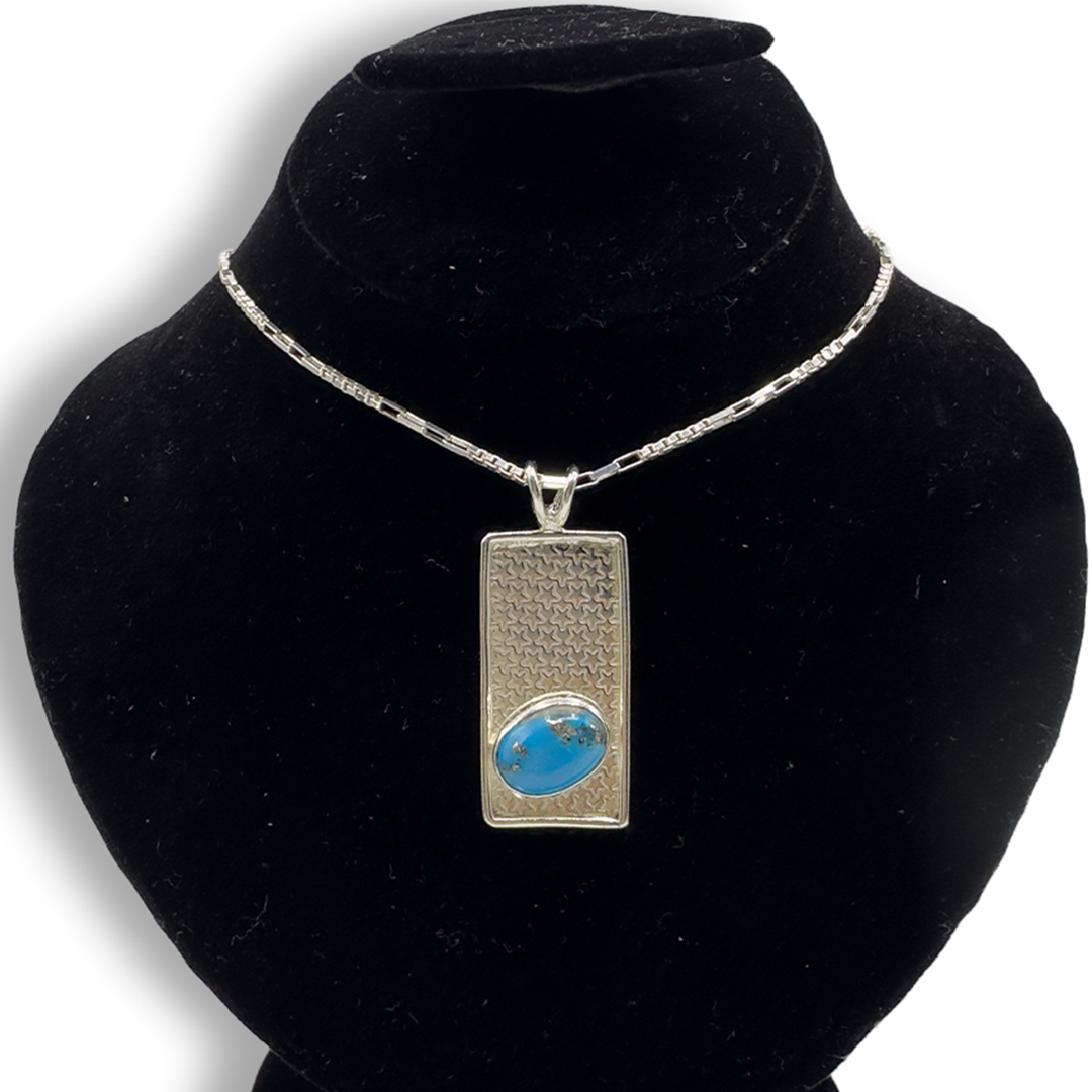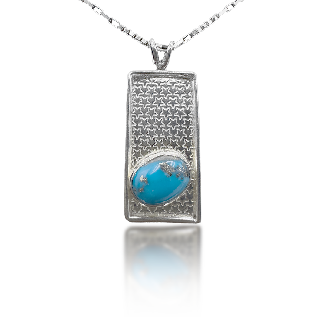 The Star Wall Design Feroza Pendant, made in pure silver, features a celestial motif that represents guidance and strength. Turquoise, revered for its protective qualities, promotes harmony and peace. The star wall design adds a touch of celestial charm, making it ideal for those who seek spiritual balance while enhancing their style with this sophisticated, elegant piece.