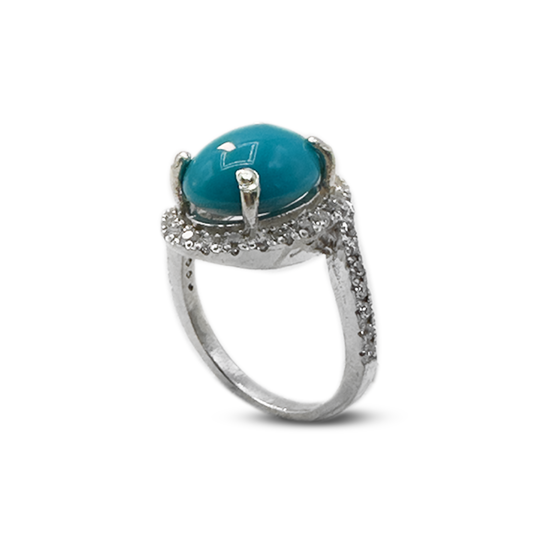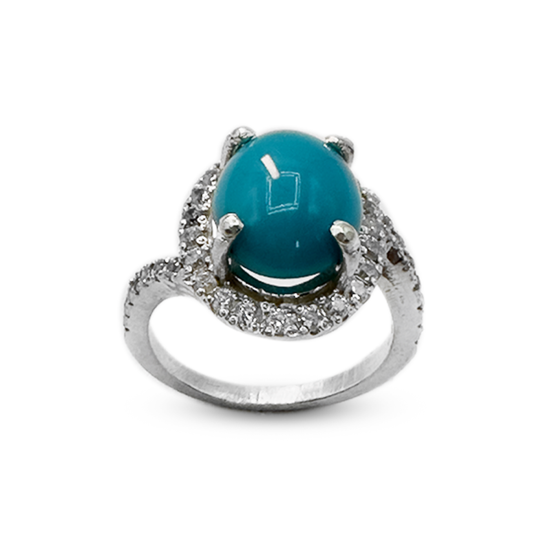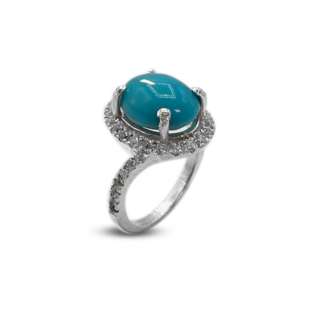 The Feroza Women Ring with Zircon Bypass design contains a stunning Feroza gemstone that is beautifully framed by a delicate bypass setting enhanced with zircon stones that sparkle. The elegant bands by Jawa Gems that cross over to form an eye-catching, modern design go well with the feroza's vivid colored tone.