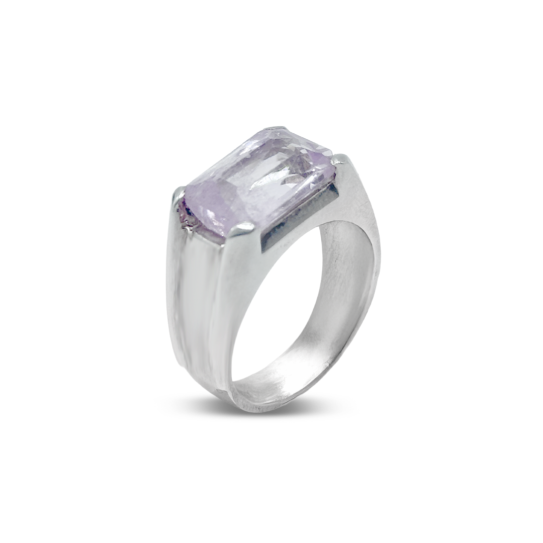 The Kunzite Men Ring with a Fancy Challa Design is made to give a stylish and unique look. This ring features a natural kunzite stone at the center, surrounded by a special Challa-style setting that adds charm and elegance. The polished band by Jawa Gems highlights the soft pink color of the stone and reflects light beautifully. Its unique design and solid build make it a perfect choice for men who like modern jewelry with a classy touch.