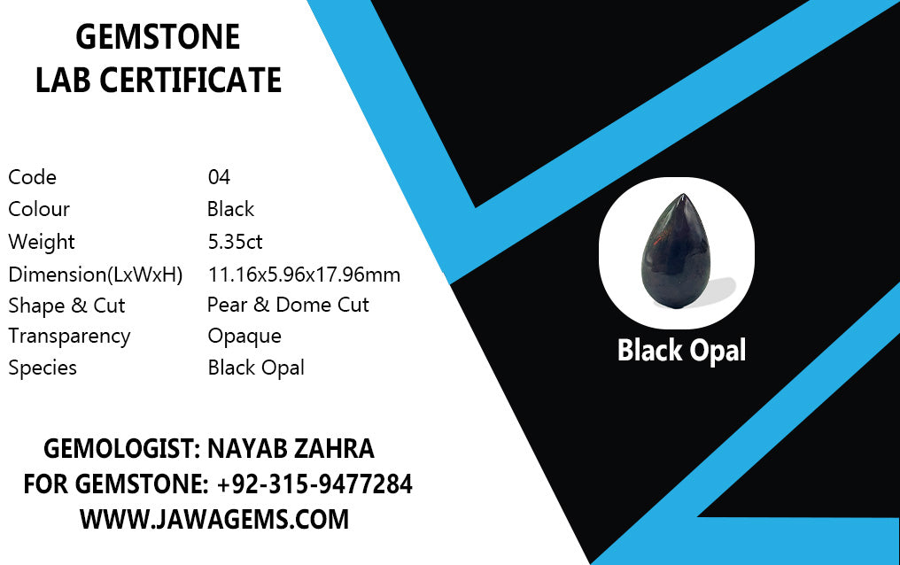 Introducing this exquisite 5.35-carat Lab Certified Black Opal, a true gem of nature known for its rich dark body and dazzling play-of-color. This Natural Black Opal is not only stunning in appearance but is also valued for its protective and intuitive energy. A powerful Black Opal stone, it enhances creativity, emotional balance, and spiritual insight. Looking for a genuine Natural Opal or wondering about the Black Opal price in Pakistan?