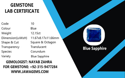 Presenting a stunning 12.15-carat Lab Certified Blue Sapphire, a gemstone renowned for its deep, mesmerizing blue hue and its powerful astrological significance. This Natural Blue Sapphire stone is known to bring wisdom, prosperity, and mental clarity to its wearer. It’s highly regarded for its ability to enhance focus, amplify energy, and attract abundance.