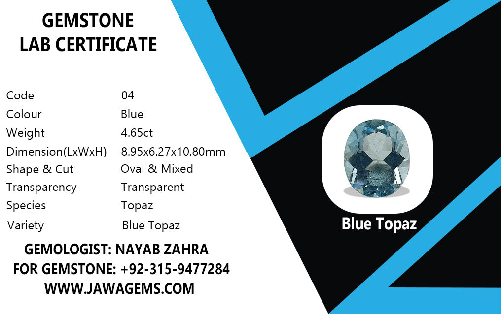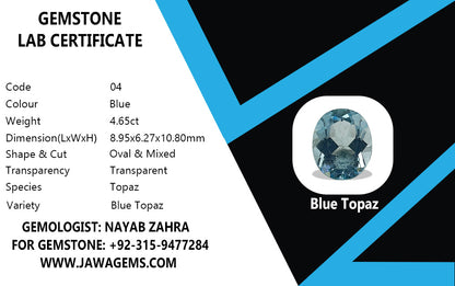 This exquisite 4.65-carat Blue Topaz is a lab-certified natural gemstone that captivates with its brilliant blue hue. Known for its clarity and calming properties, blue topaz is believed to promote emotional healing, communication, and mental clarity. It is often associated with peace and tranquility, making it perfect for those seeking to enhance focus, creativity, and harmony in their lives. This vibrant stone offers both beauty and powerful energy for personal growth.