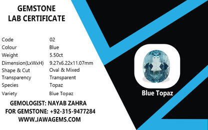 This exquisite 5.5-carat Blue Topaz is a lab-certified natural gemstone that captivates with its brilliant blue hue. Known for its clarity and calming properties, blue topaz is believed to promote emotional healing, communication, and mental clarity. It is often associated with peace and tranquility, making it perfect for those seeking to enhance focus, creativity, and harmony in their lives. This vibrant stone offers both beauty and powerful energy for personal growth.