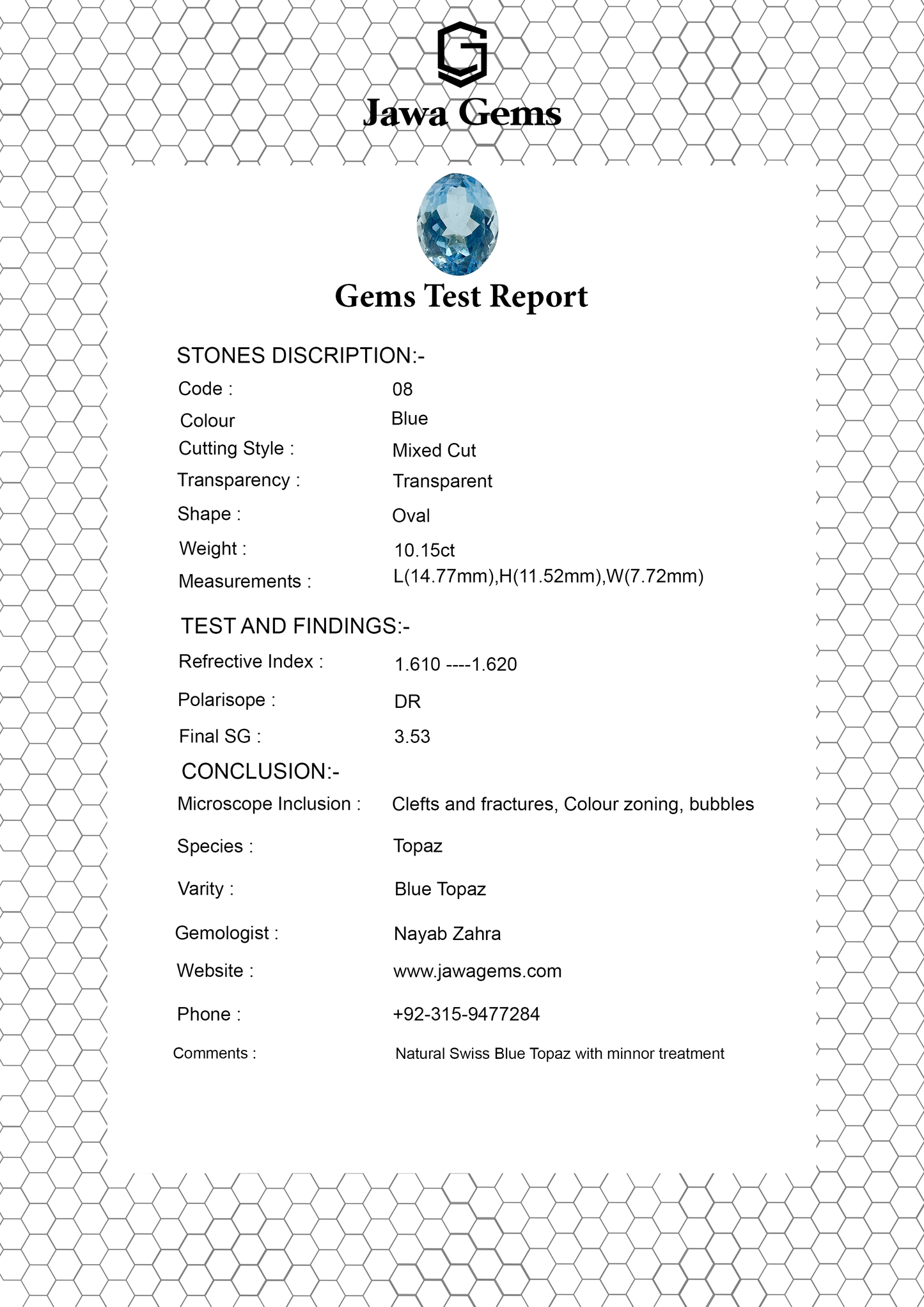 This 10.15-carat Swiss Blue Topaz is a striking natural gemstone, lab-certified for authenticity. Renowned for enhancing communication and self-expression, it supports mental clarity, emotional balance, and creativity. Naturally sourced and brilliantly hued, this vibrant blue topaz channels calming energy and confidence, making it a powerful talisman for clarity, inspiration, and personal growth.