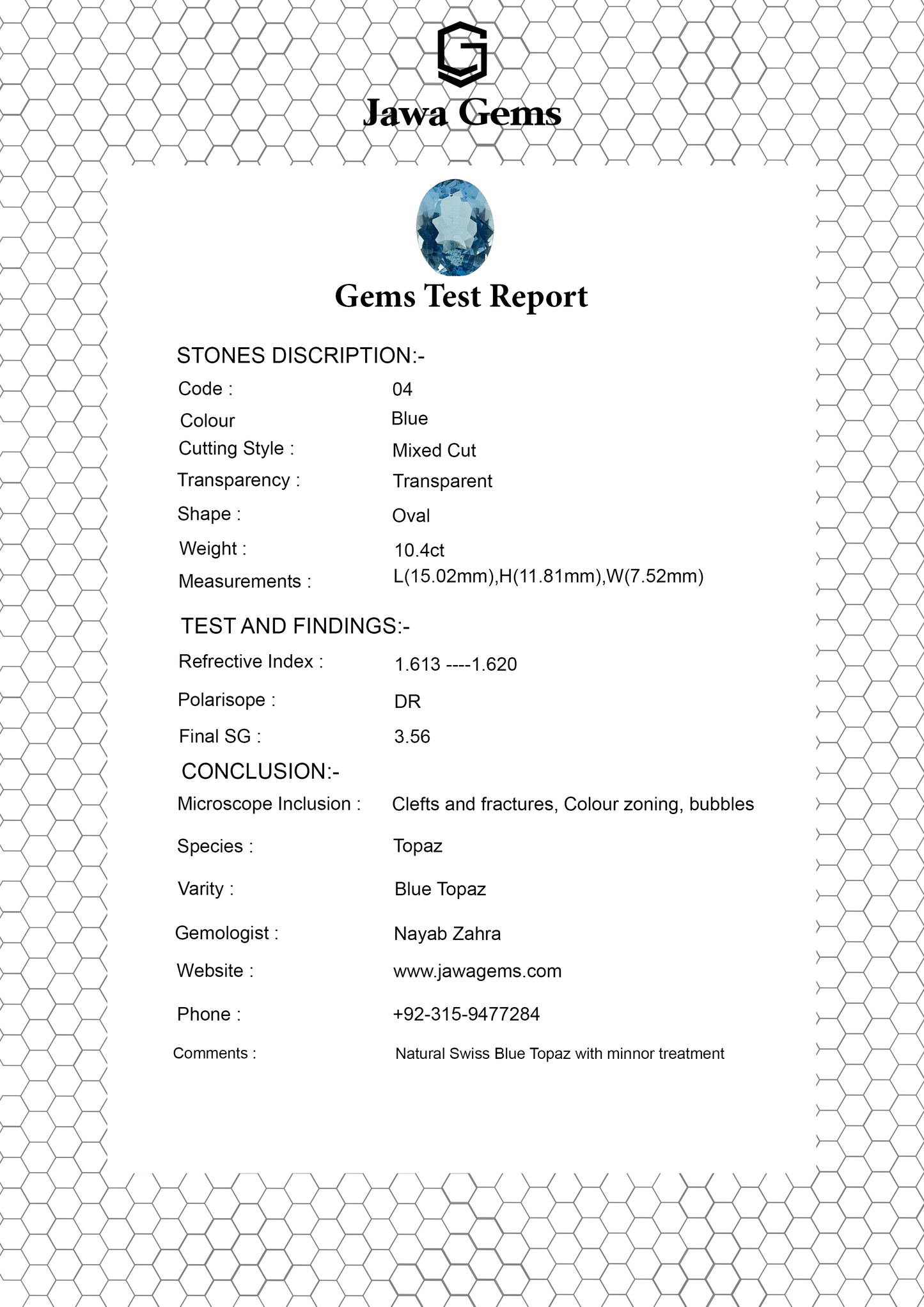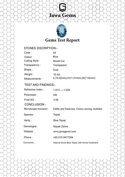 This 10.4-carat Swiss Blue Topaz is a striking natural gemstone, lab-certified for authenticity. Renowned for enhancing communication and self-expression, it supports mental clarity, emotional balance, and creativity. Naturally sourced and brilliantly hued, this vibrant blue topaz channels calming energy and confidence, making it a powerful talisman for clarity, inspiration, and personal growth.
