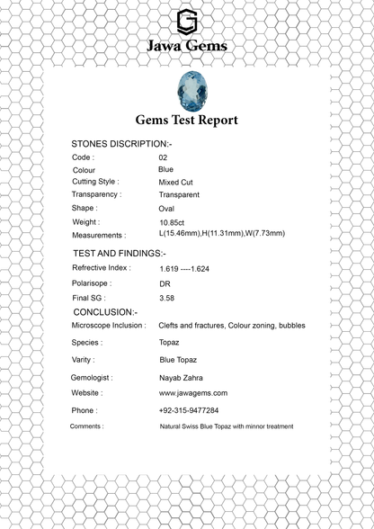 This 10.85-carat Swiss Blue Topaz is a striking natural gemstone, lab-certified for authenticity. Renowned for enhancing communication and self-expression, it supports mental clarity, emotional balance, and creativity. Naturally sourced and brilliantly hued, this vibrant blue topaz channels calming energy and confidence, making it a powerful talisman for clarity, inspiration, and personal growth.