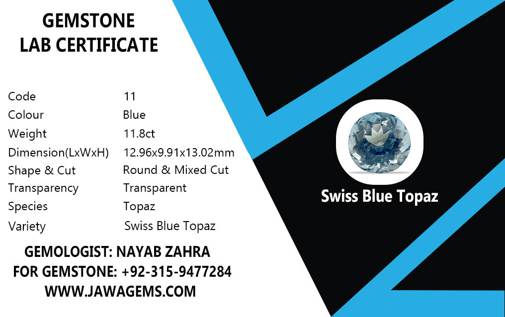 This 11.8-carat Swiss Blue Topaz is a striking natural gemstone, lab-certified for authenticity. Renowned for enhancing communication and self-expression, it supports mental clarity, emotional balance, and creativity. Naturally sourced and brilliantly hued, this vibrant blue topaz channels calming energy and confidence, making it a powerful talisman for clarity, inspiration, and personal growth.