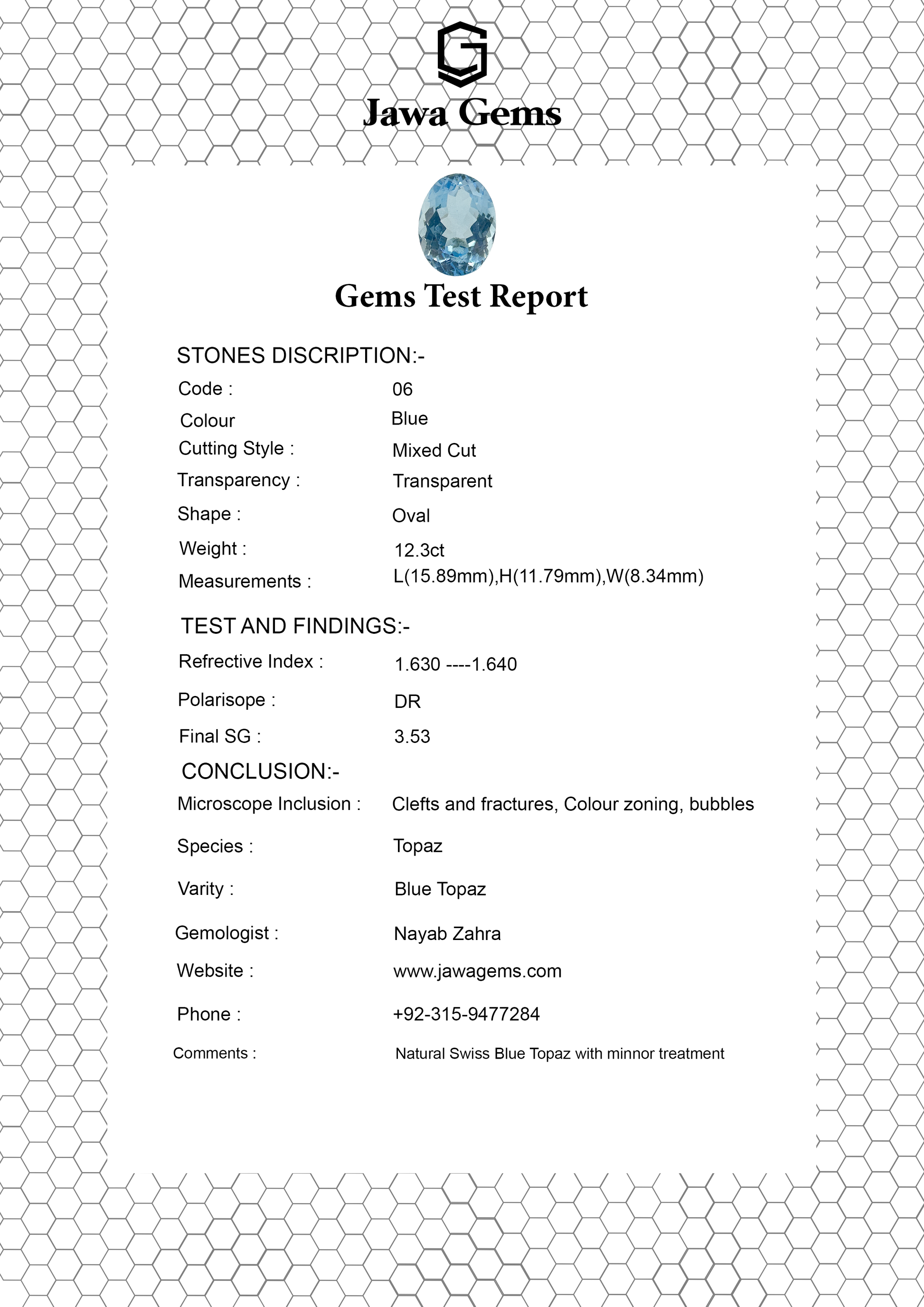 This 12.3-carat Swiss Blue Topaz is a striking natural gemstone, lab-certified for authenticity. Renowned for enhancing communication and self-expression, it supports mental clarity, emotional balance, and creativity. Naturally sourced and brilliantly hued, this vibrant blue topaz channels calming energy and confidence, making it a powerful talisman for clarity, inspiration, and personal growth.