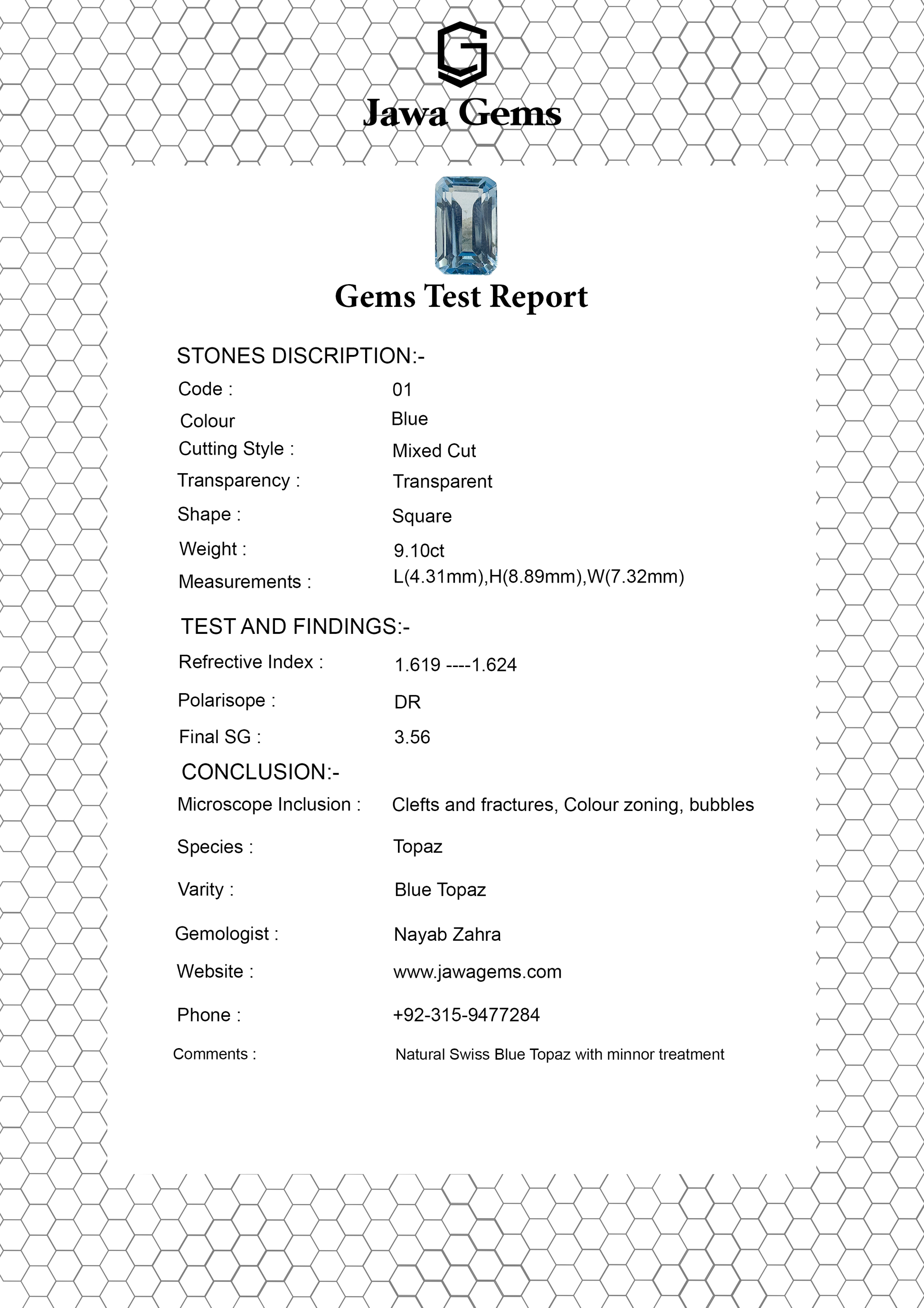 This 9.1-carat Swiss Blue Topaz is a striking natural gemstone, lab-certified for authenticity. Renowned for enhancing communication and self-expression, it supports mental clarity, emotional balance, and creativity. Naturally sourced and brilliantly hued, this vibrant blue topaz channels calming energy and confidence, making it a powerful talisman for clarity, inspiration, and personal growth.