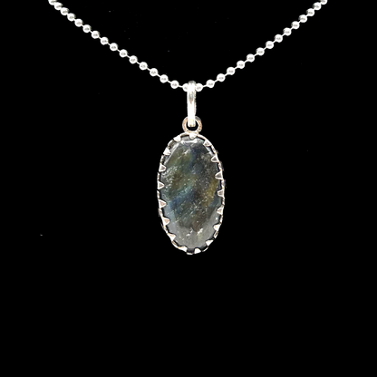 The Labradorite Pendant - Faceted Over features a beautifully faceted labradorite stone, which enhances its stunning iridescence. Labradorite is known for its protective qualities and ability to stimulate spiritual growth. The silver setting accentuates the stone’s natural beauty, making this pendant an elegant choice for those who seek a balance of beauty and spiritual well-being.