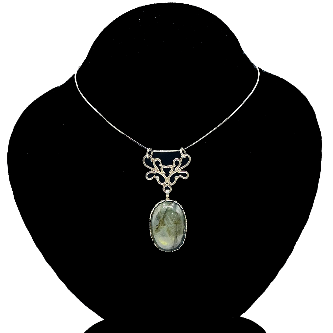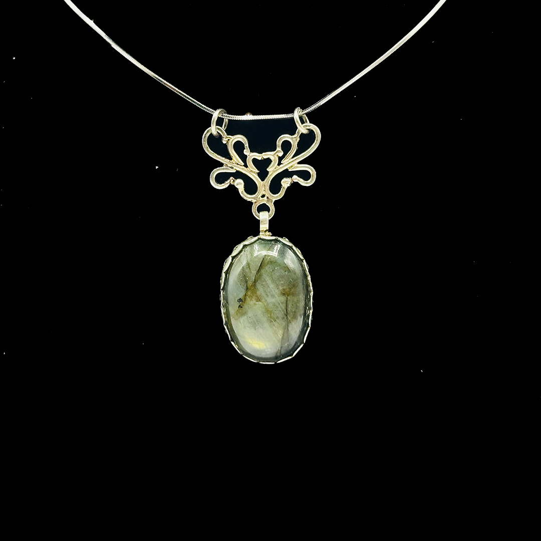 The Labradorite Pendant - Horn Lock Design features a unique horn-shaped design that frames a vibrant labradorite stone. Labradorite is celebrated for its transformative and protective qualities, making it the ideal gemstone for promoting mental clarity and inner strength. The silver setting enhances the stone’s iridescence, creating a striking and meaningful piece for any collection.