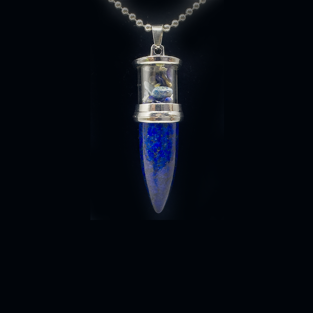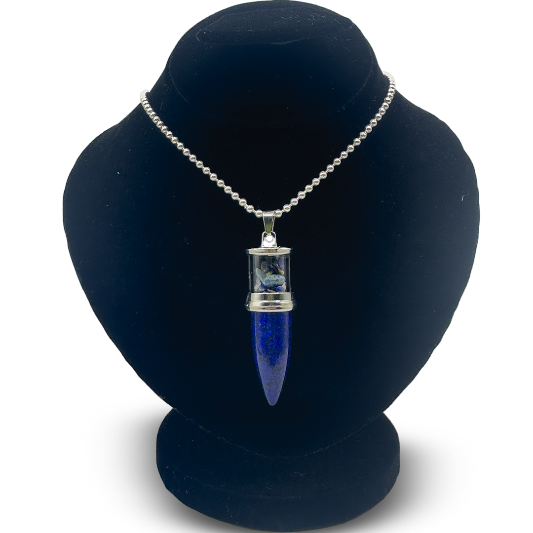 The Lapis Pendant - AK Bullet Design from Jawa Gems combines boldness with sophistication, featuring a lapis lazuli gemstone set in pure silver with an AK-inspired bullet design. Lapis lazuli is believed to enhance clarity of thought, boost communication, and promote emotional balance. This pendant is ideal for those seeking a unique accessory that also supports their mental and spiritual well-being.