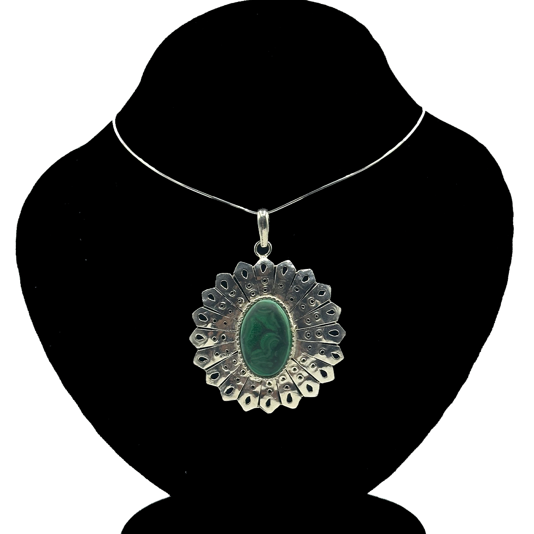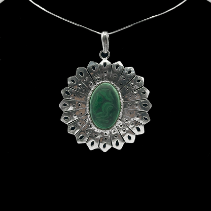 This Malachite Pendant in Sun Shine Design features a vibrant green malachite stone shaped to mimic the rays of the sun. The bright, radiant design symbolizes energy and renewal, making it a striking statement piece that adds depth and vitality to your ensemble.
