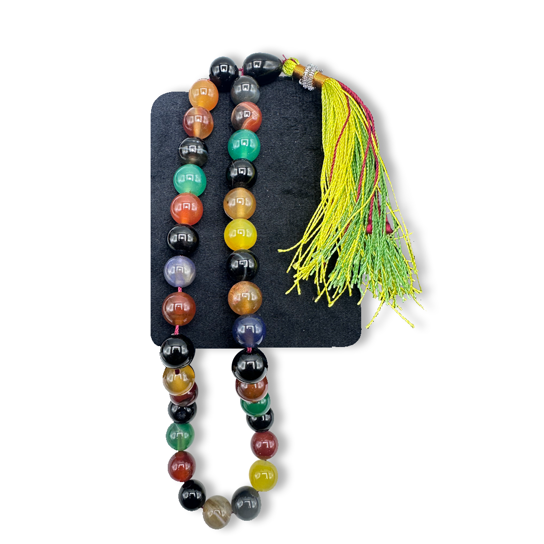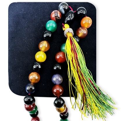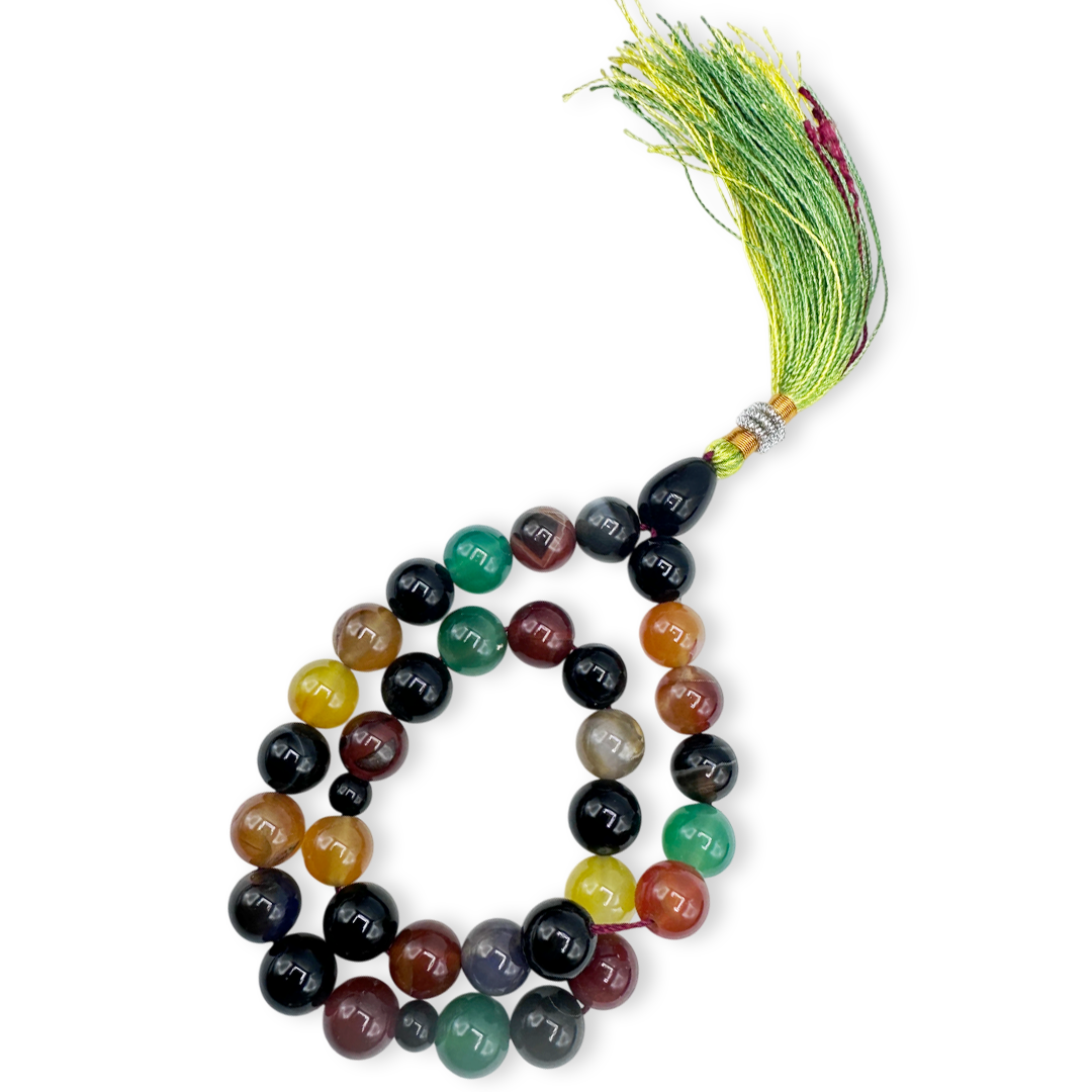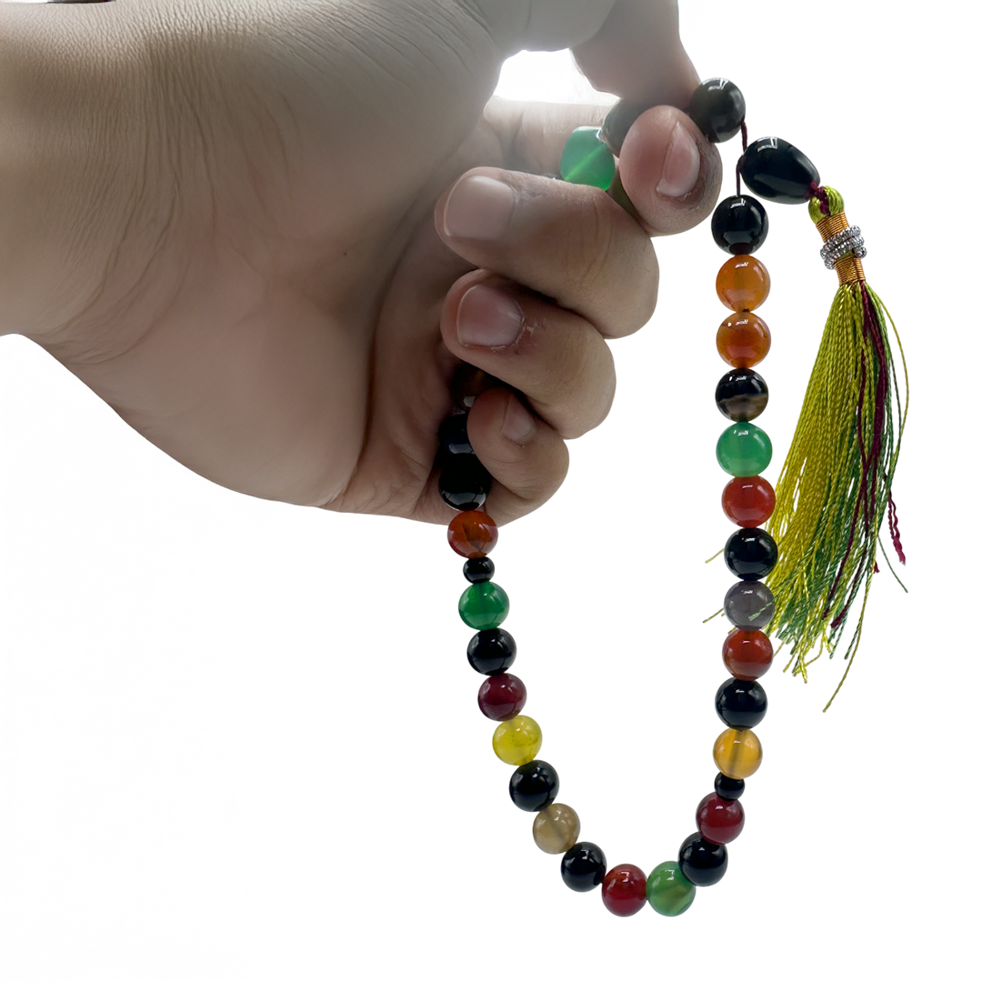 Featuring vibrant 10mm Aqeeq beads, this Tasbih helps enhance clarity, wisdom, and protection. Its multi-colored design adds a touch of beauty to any spiritual practice.