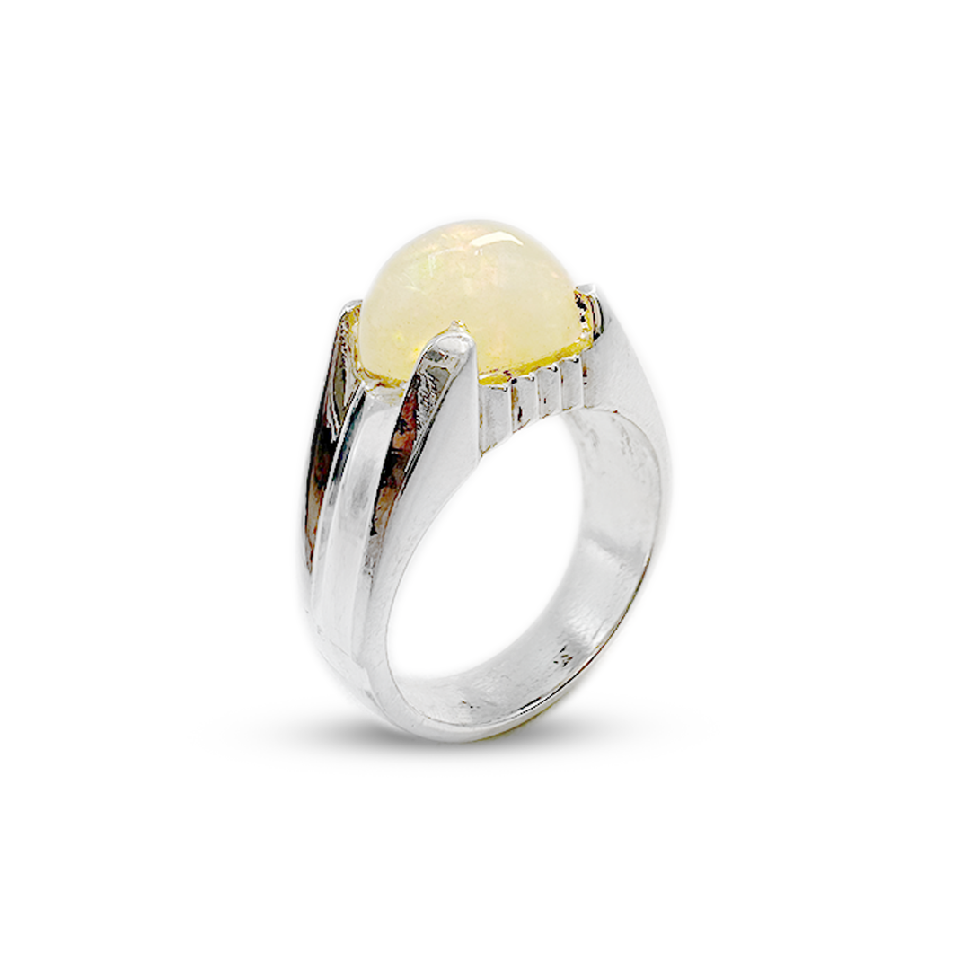Discover the beauty of geometric design with the Opal Men Ring by Jawa Gems This unique ring has an opal in the center, surrounded by a band that looks like a Sigma Tower. The band's simple lines and architectural elements brilliantly enhance the opal's vivid colors, producing a powerful visual impact.