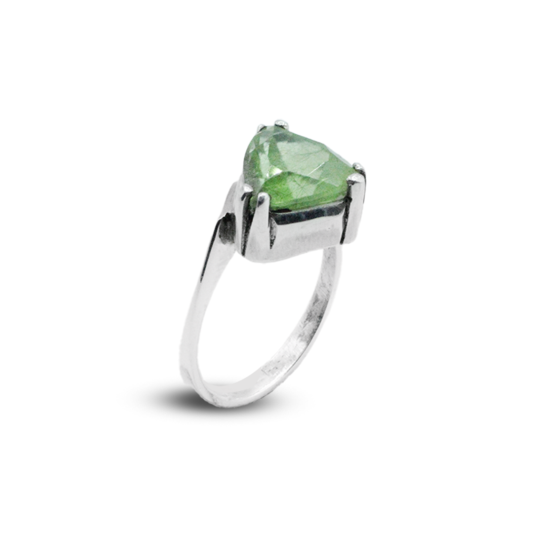 Peridot Women Ring is a beauty of geometric elegance offered by Jawa Gems. This trigon ring design, which showcases a specially cut peridot stone set inside a triangle frame, is an honor to contemporary artwork. The polished metal triangular form creates a striking contrast with the vivid green gemstone.