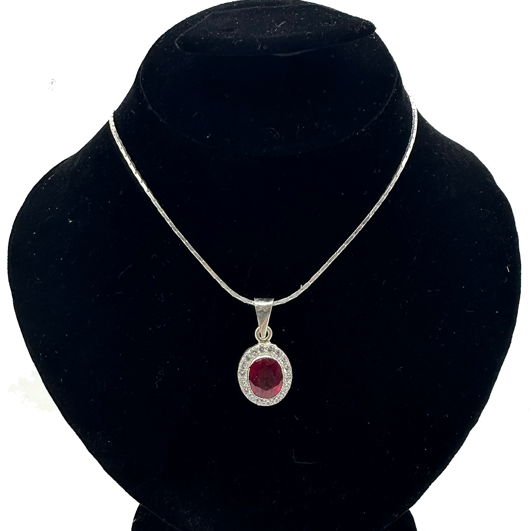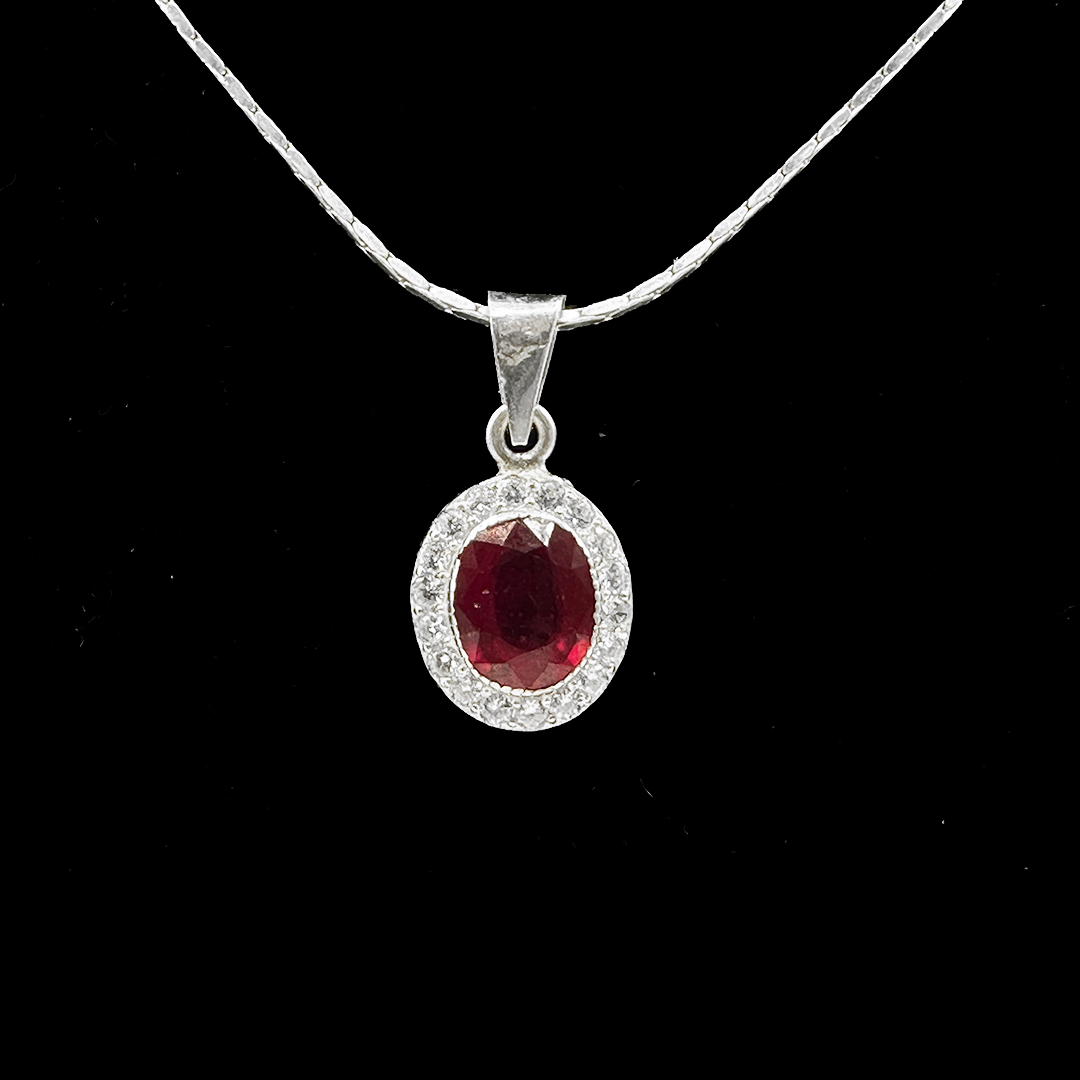 This graceful Ruby pendant features a stunning ruby stone encased within a shimmering halo, radiating beauty and warmth. Known for their grounding properties, rubies promote stability, emotional strength, and enhance energy flow, creating balance and passion in your life.