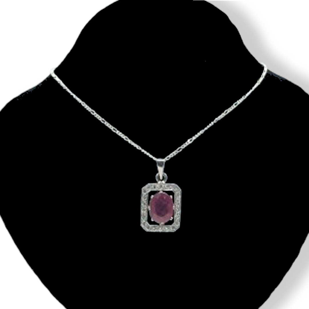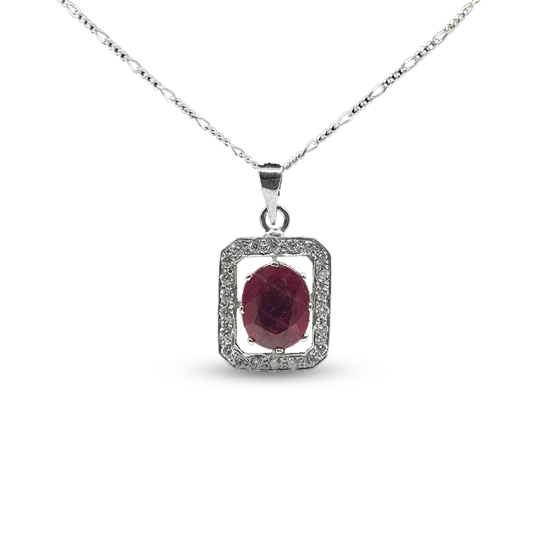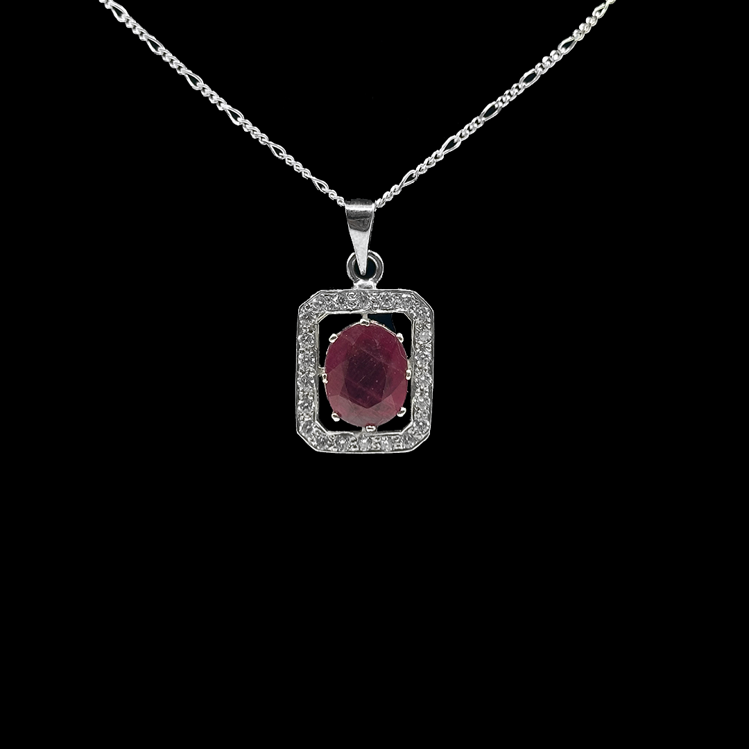 A rectangular-shaped pendant, featuring a stunning ruby stone encircled by a subtle halo of pure silver. This design enhances the ruby’s energy, boosting confidence, love, and vitality. Rubies are also said to protect the wearer and bring clarity to their emotional and physical state.