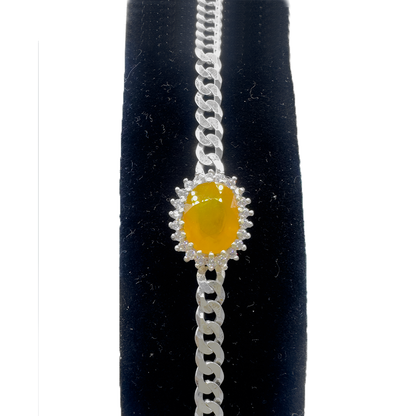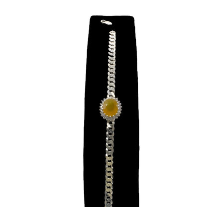The Yellow Sapphire Bracelet - Halo Fame, designed in pure silver, offers a chic and elegant touch to any outfit. Its halo setting enhances the natural brilliance of the yellow sapphire, believed to increase wealth and wisdom. Yellow sapphires are also thought to improve decision-making and offer emotional strength, making this bracelet a meaningful choice for every occasion.