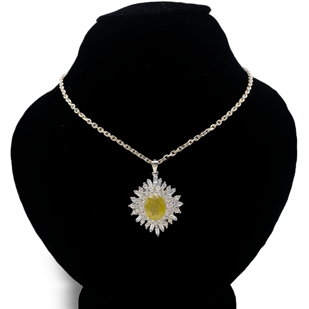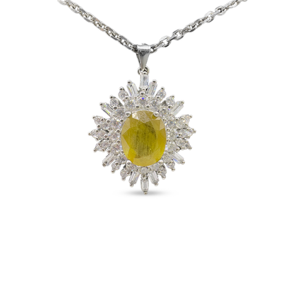 The Yellow Sapphire Pendant - Crystal Cup design by Jawa Gems blends contemporary design with classic elegance. This pendant, made from pure silver, showcases a brilliant yellow sapphire. Yellow sapphires are said to bring clarity and abundance, making this pendant a perfect piece for those looking to enhance their life with positivity and wealth.