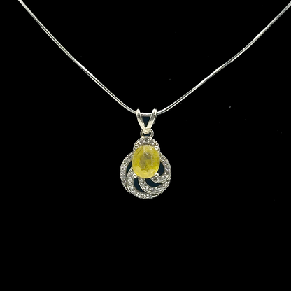 The Yellow Sapphire Pendant in Pine Wear Design by Jawa Gems combines the bright, uplifting energy of Yellow Sapphire with a unique pine-inspired design. Known for attracting abundance and success, Yellow Sapphire is believed to stimulate intellect and clear decision-making. The elegant pine motif adds a natural, serene element to the piece, making it a perfect symbol of growth and prosperity. Wear this pendant to harness positivity and bring balance to your life.