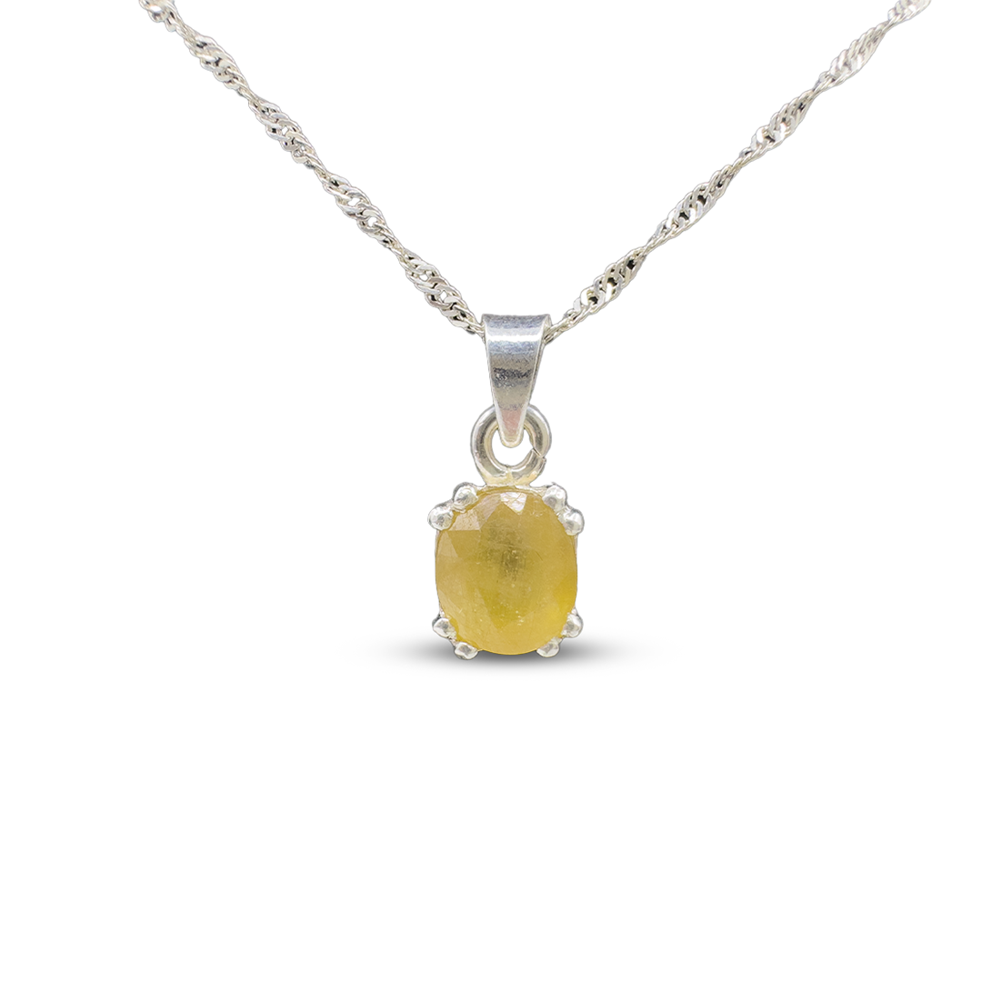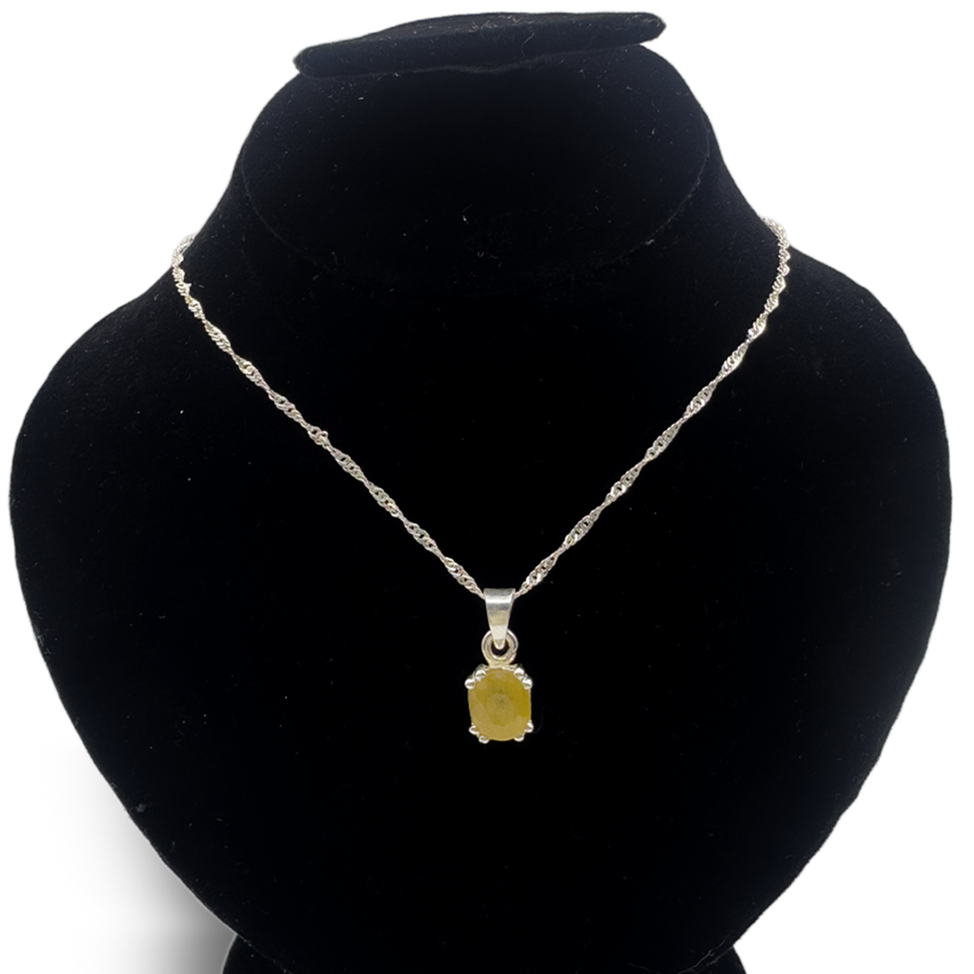 The Yellow Sapphire Pendant - Square Fort Design from Jawa Gems offers a contemporary look in pure silver. The square design highlights the vibrant yellow sapphire, symbolizing strength and protection. Yellow sapphires are believed to bring wealth, success, and mental clarity, making this pendant both a beautiful accessory and a meaningful piece of jewelry.