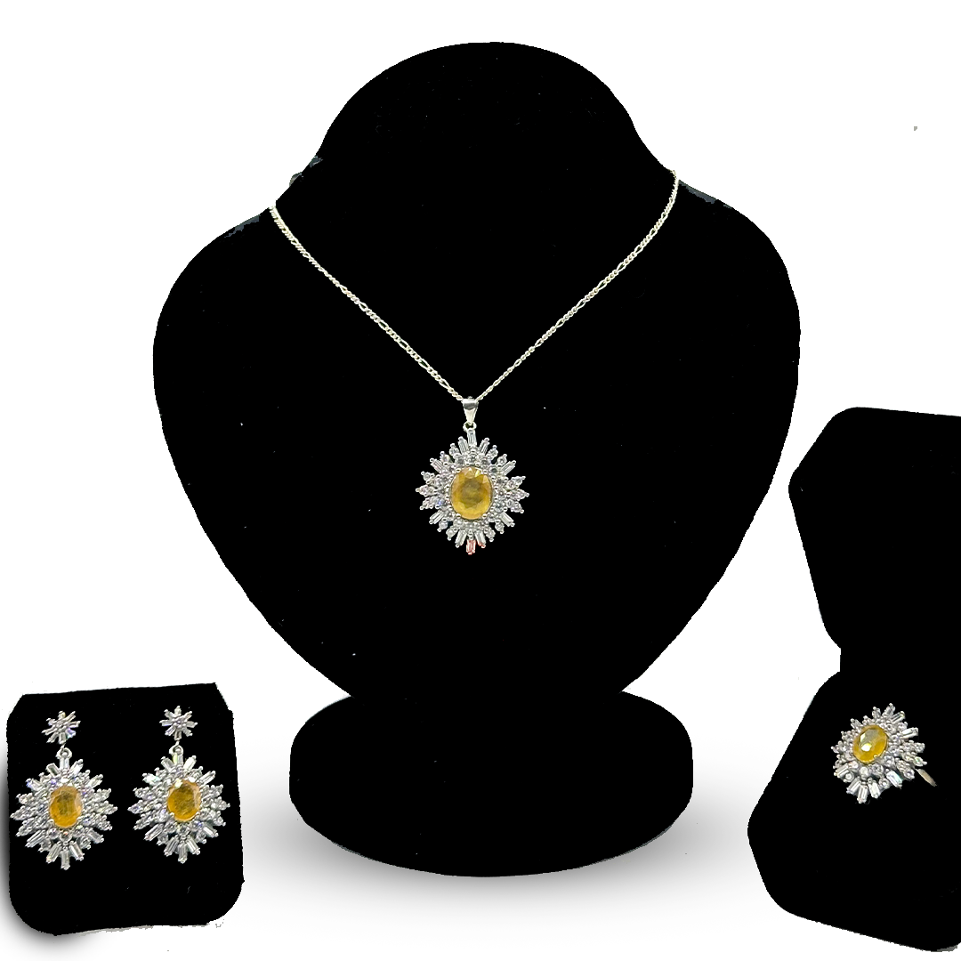 Jawa Gems’ Yellow Sapphire Set in Snow Crystal Design is a captivating collection that highlights the brilliance of Yellow Sapphire, a gemstone known for its power to enhance creativity and attract wealth. The snow crystal design reflects purity and elegance, while the Yellow Sapphires bring warmth and positivity. This set is perfect for those who wish to wear a combination of grace and strength, offering both aesthetic appeal and spiritual upliftment.