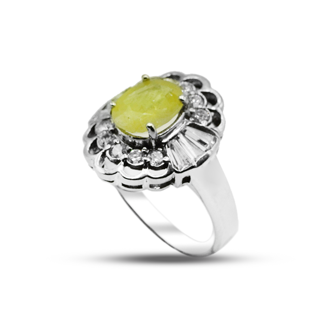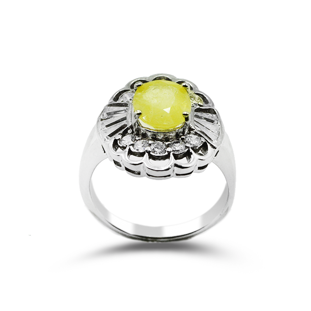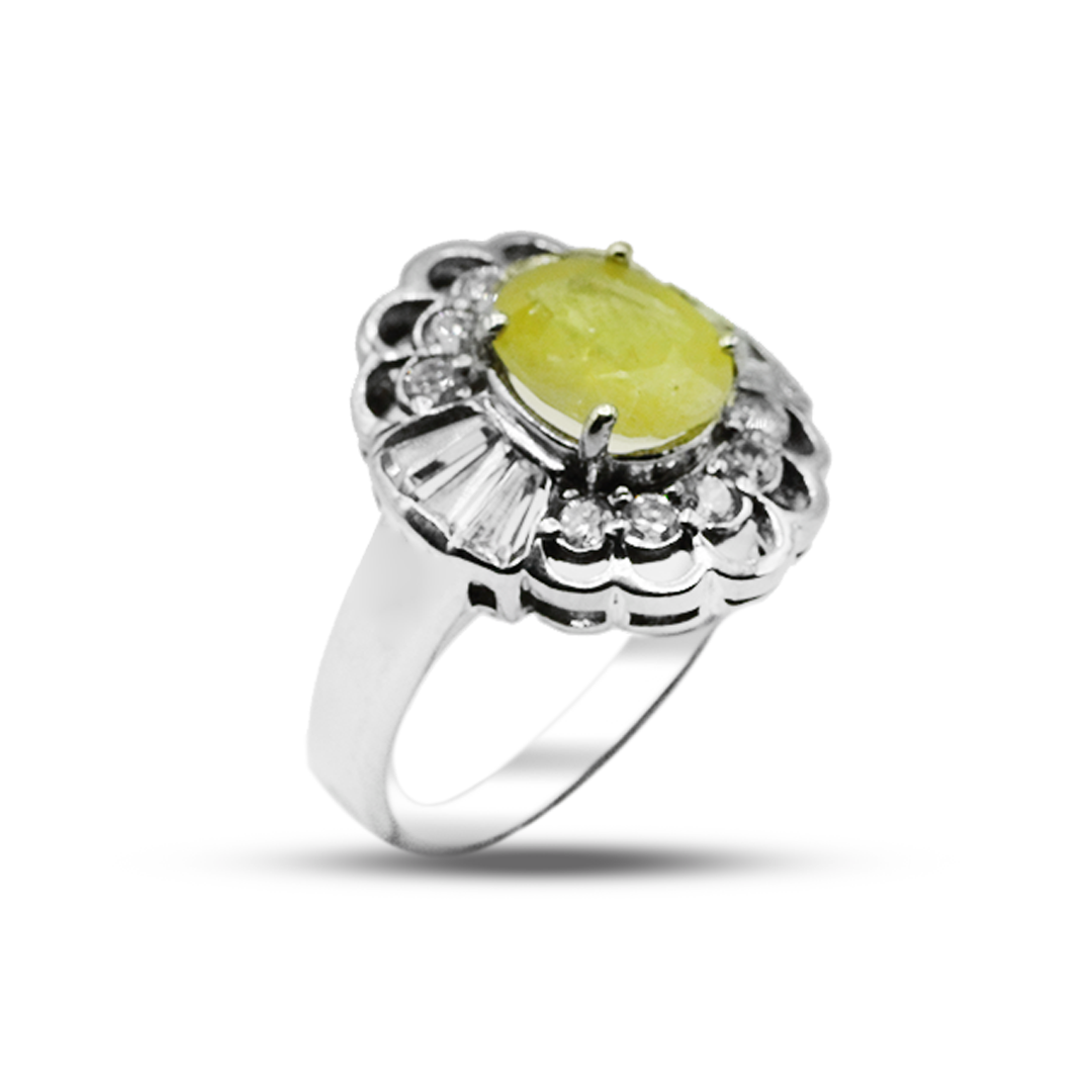 The Yellow Sapphire Ladies Ring Flower Cup Design by Jawa Gems is both beautiful and classic. This ring looks beautiful with any outfit because it has a beautiful yellow gem set in a beautiful flower cup design. It's a lovely piece of jewelry that shows traditional beauty and is perfect for the cultured woman who likes one-of-a-kind pieces.